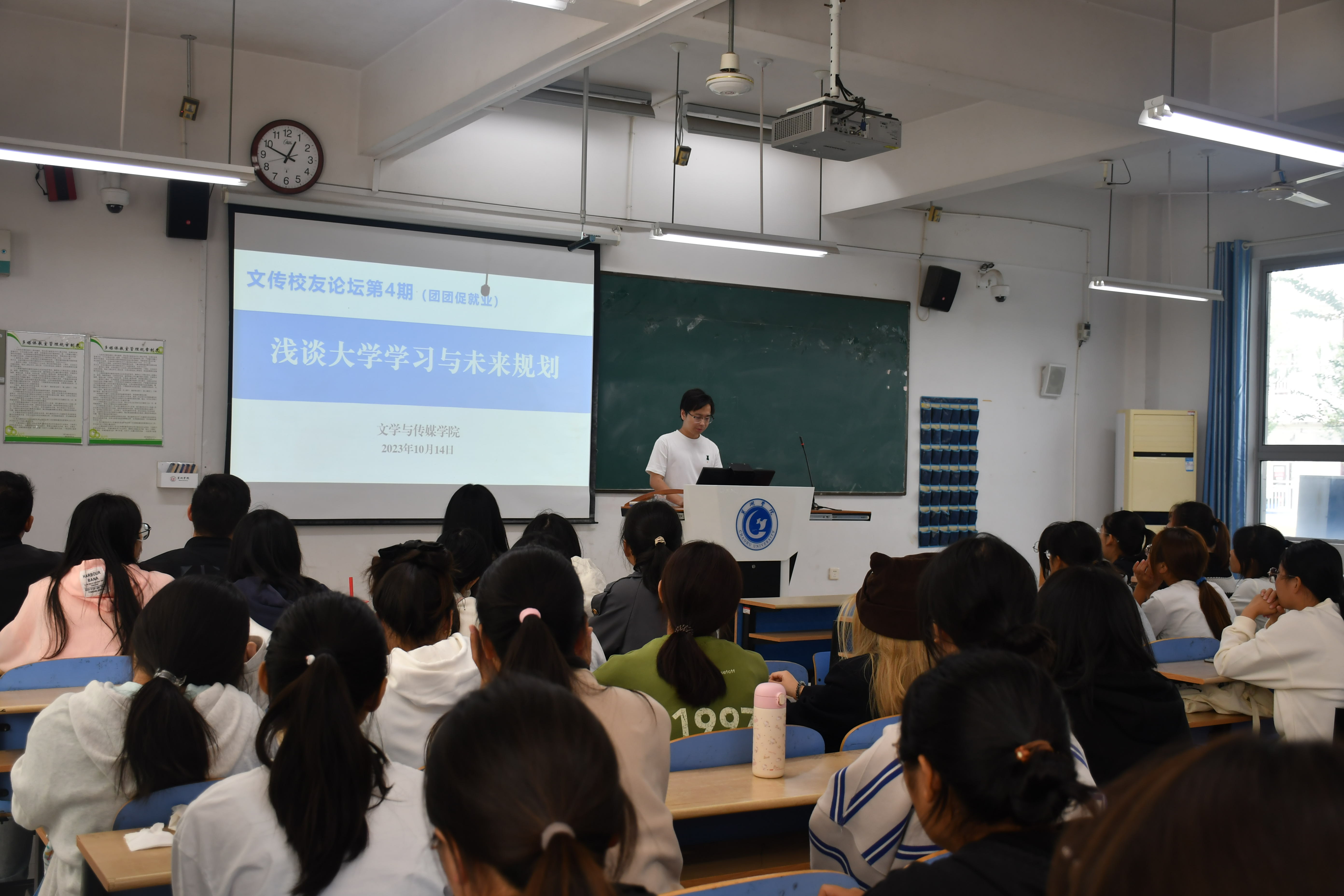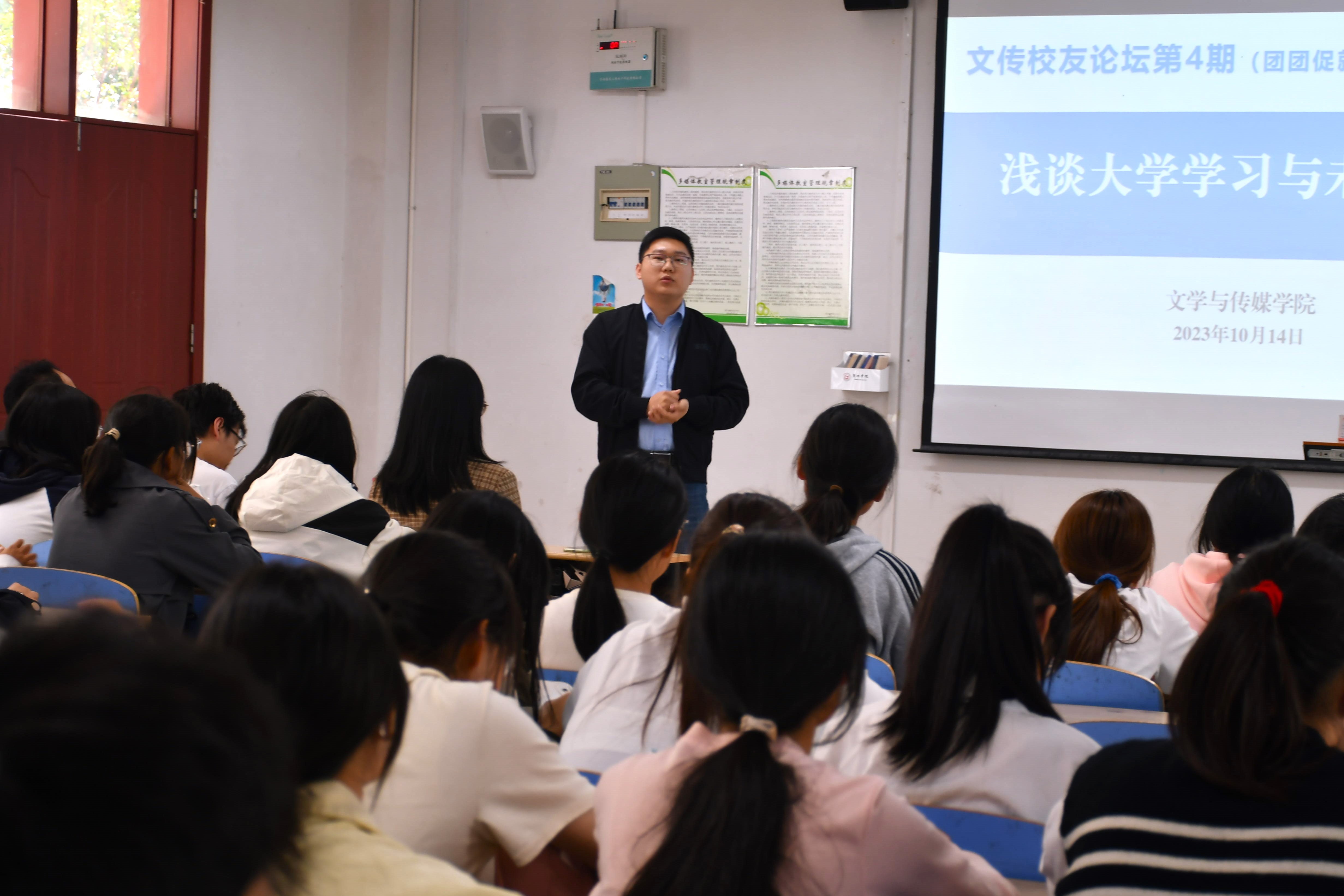 为进一步发挥优秀校友的示范引领作用,推进团团促就业专项行动。文学与传媒学院第四期校友论坛于10月14日中午在慎思楼中102举办。此次论坛以“浅谈大学学习与未来规划”为主题,2014级广播电视学专业刘宝新、汪晨两位校友受邀参加论坛。论坛由新媒体系教师李亚萍主持,副院长、新媒体系主任王宇明和2023级网络与新媒体专业全体同学参加论坛。