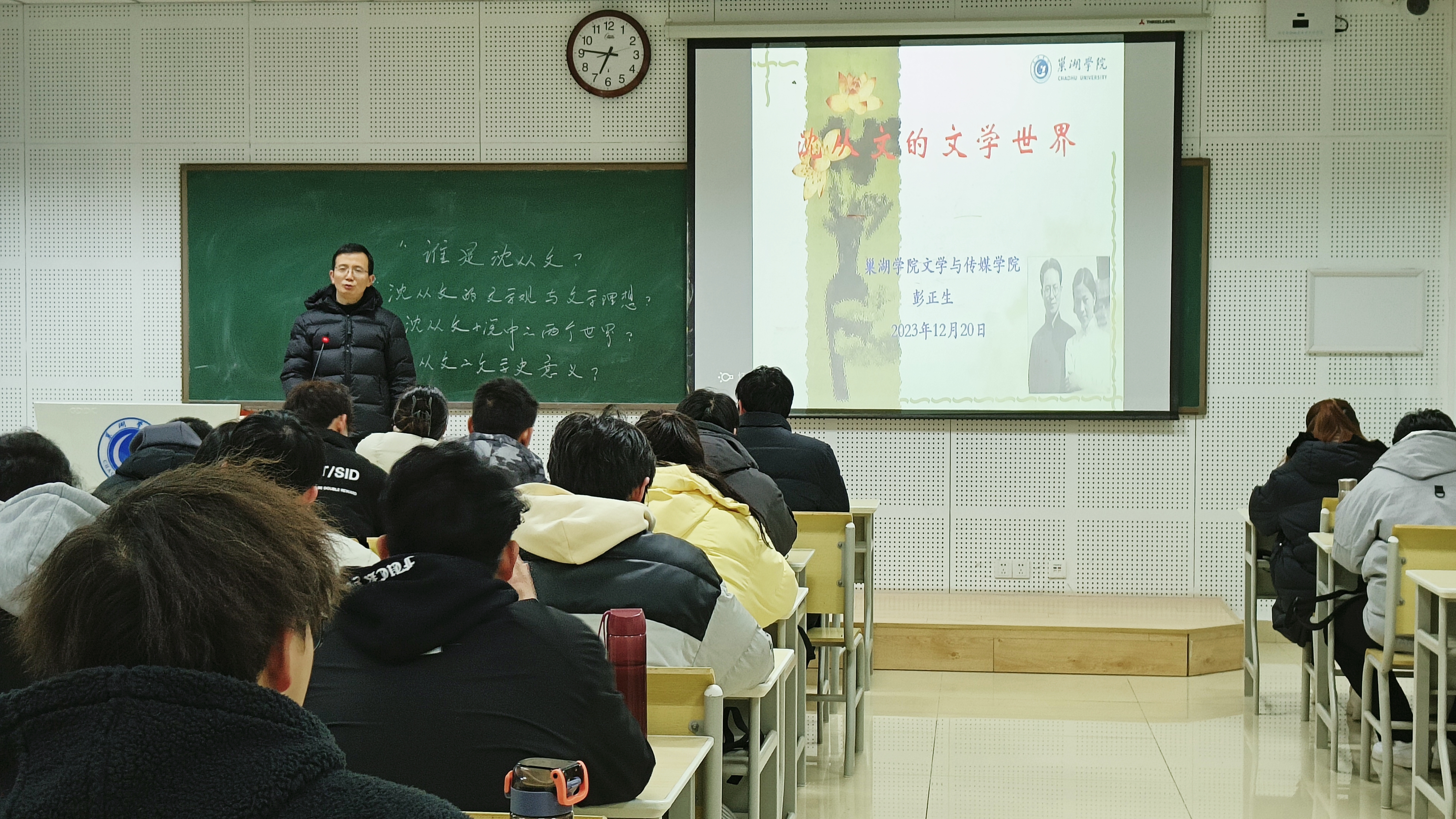 12月20日晚,文学与传媒学院彭正生教授在崇学楼南202教室做题为“沈从文的文学世界”专题学术讲座,2022级汉语言文学专业部分同学、感兴趣的其他专业学生到现场聆听了讲座。