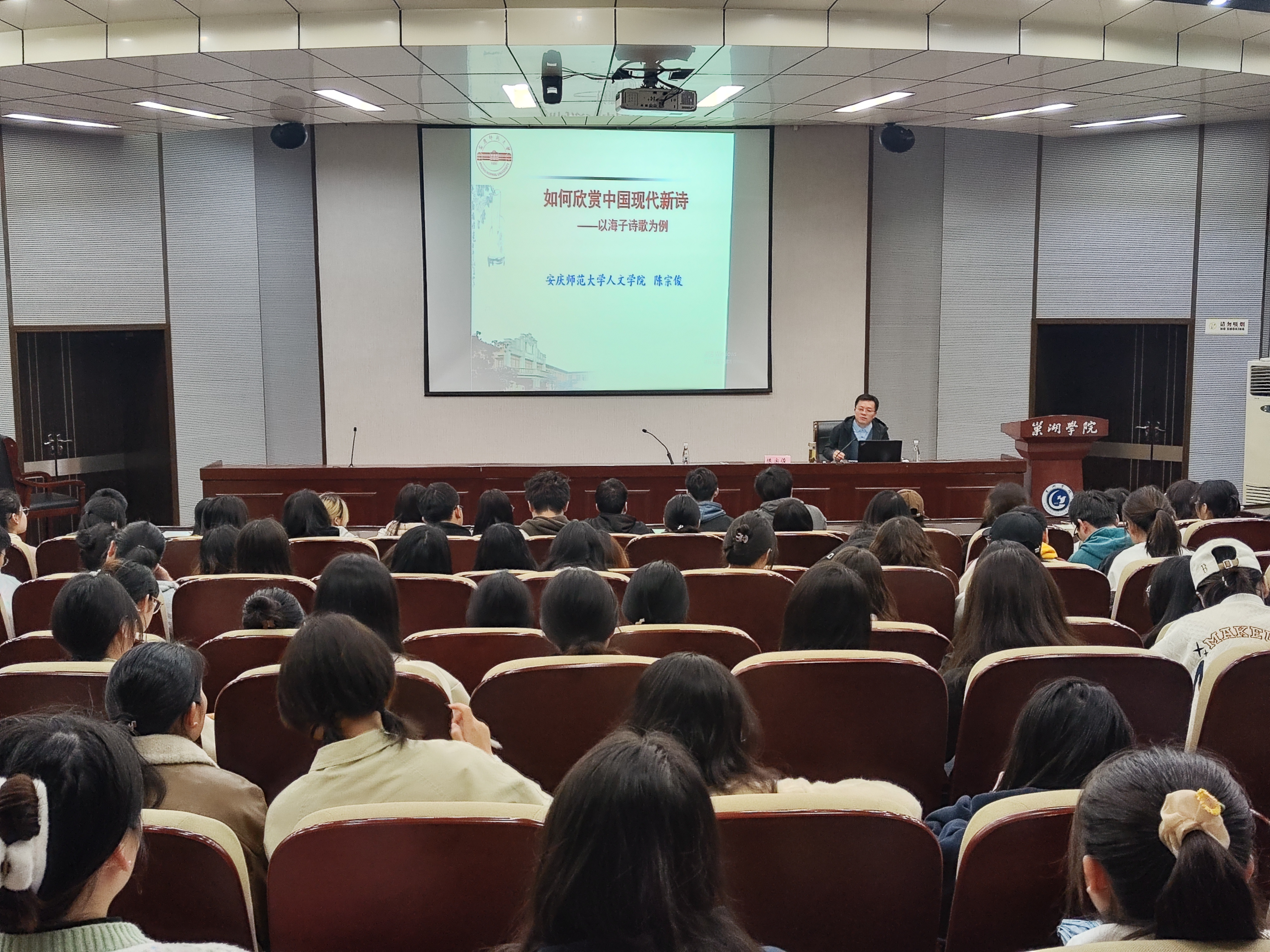 3月23日上午,文学与传媒学院第9期“汤山文学讲坛”在学校致知楼报告厅举办。安庆师范大学陈宗俊教授应邀作题为“如何欣赏中国现代新诗——以海子诗歌为例”的学术讲座。学院教师和学生代表150余人参加,讲座由中文系主任吴强主持。
