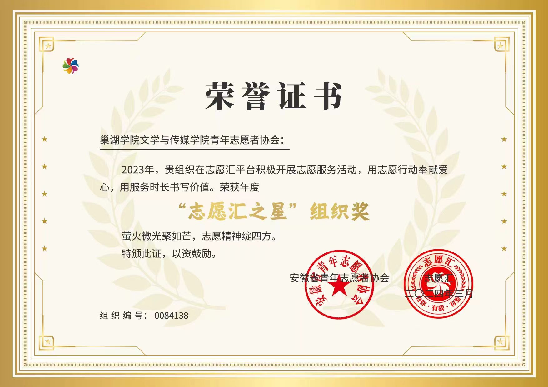 近日,文学与传媒学院青年志愿者协会获评安徽省2023年度“志愿汇之星”组织奖。该奖项由安徽省青年志愿者协会根据年度志愿服务活动次数、服务时长、工作组织力度等方面进行评选,全省共评选100个组织。这是继2023年学院获评必赢76net官网优秀青年志愿者协会后取得的又一项集体荣誉。