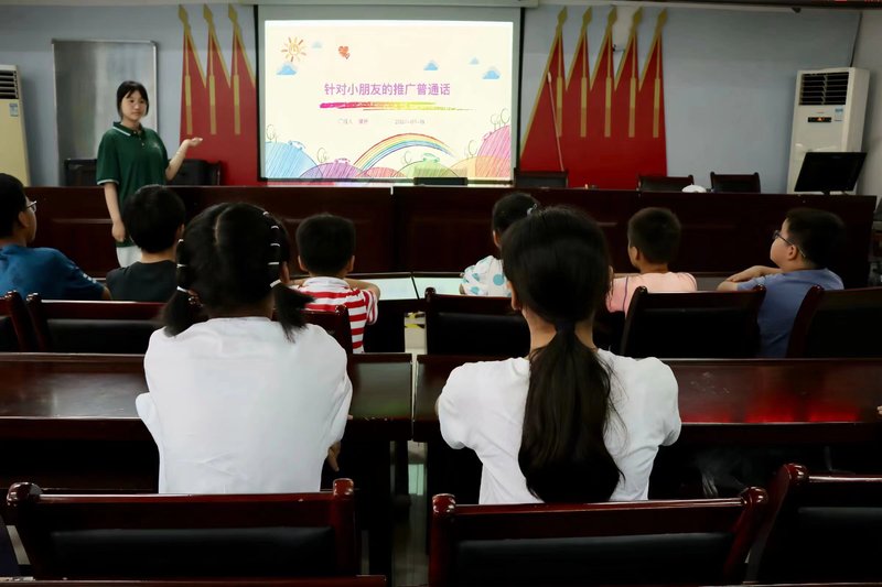 观看推普视频。实践团在黄麓镇当地村委会的帮助下召集小朋友们观看推普视频,在寓教于乐中引导他们感受普通话和规范字的魅力。过程中,实践团设置了互动环节,鼓励小朋友们积极参与。通过问答、模拟对话等形式,加深小朋友们对普通话知识的理解,提高他们的实际运用能力。现场气氛活跃,笑声与掌声不断,充分展现了大家对推普工作的支持和热情。