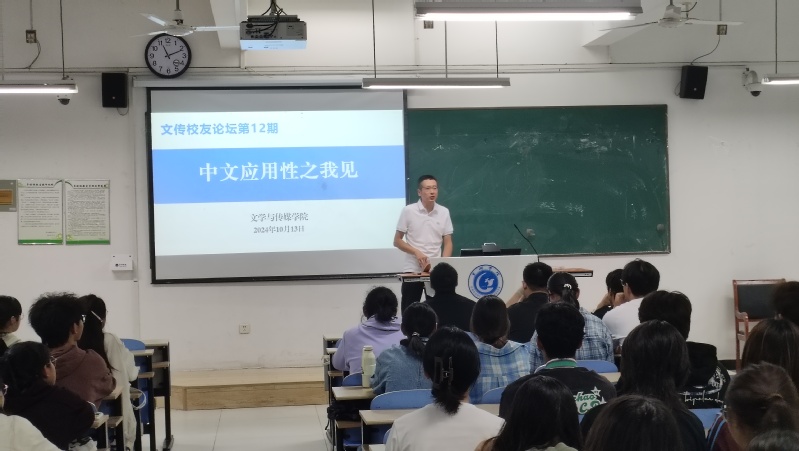 10月13日上午,值2024年校友返校日暨首届秩年校友返校活动之际,文学与传媒学院在慎思楼北102教室举办了第12期文传校友论坛,邀请8位中文系校友,让他们与2024级汉语言文学专业同学面对面交流,畅谈对中文应用性的理解。论坛由学院党委书记袁凤琴主持。