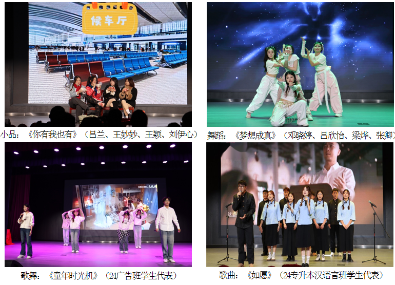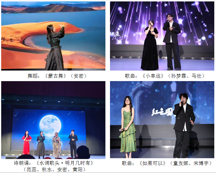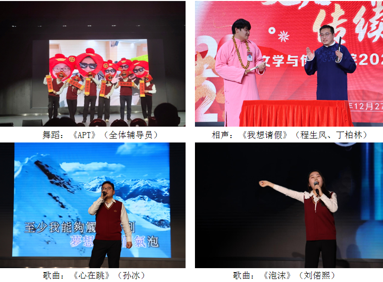 辅导员们的舞蹈《APT》引起学生们震耳欲聋的欢呼;孙冰、刘偌熙的歌曲悠扬,婉婉道来;相声《我要请假》诙谐幽默,欢声笑语;歌曲对唱《小幸运》《如果可以》情感细腻,甜蜜温情;蒙古国留学生的舞蹈天地辽阔,粗犷豪放;四位留学生的诗词歌唱韵味十足,展现了扎实的汉语功底。