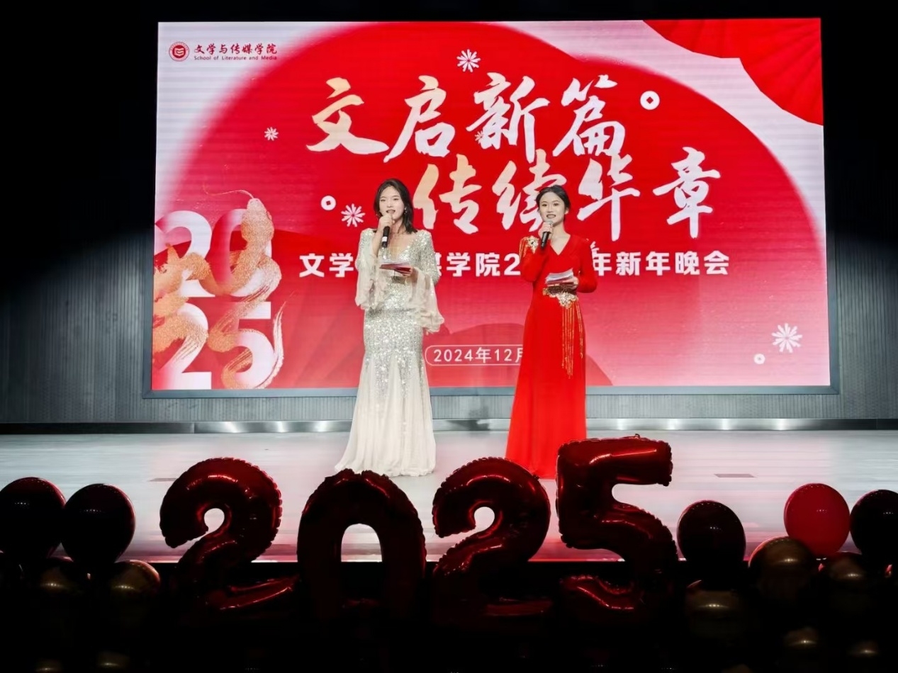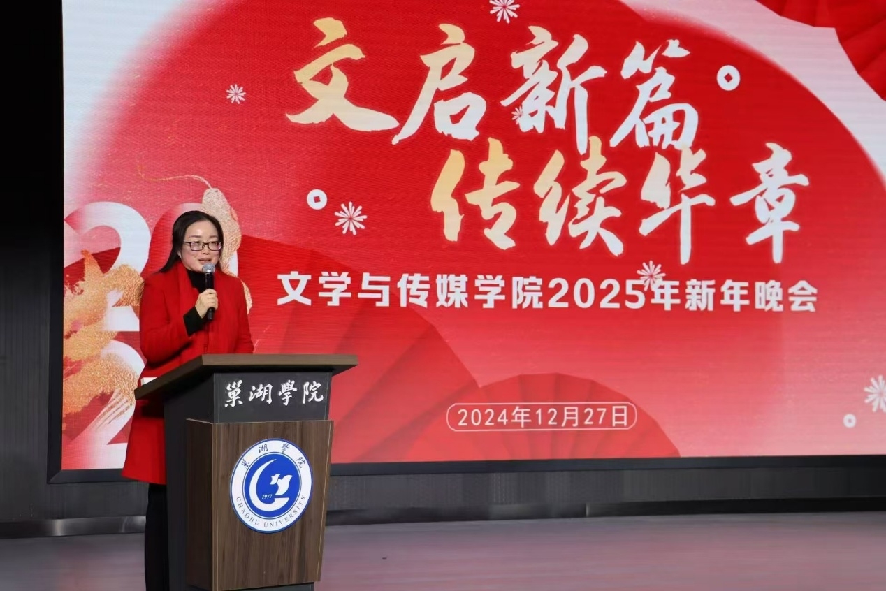 晚会伊始,袁凤琴发表新年致辞。在她的讲话中,回顾了文学与传媒学院2024年在人才培养、学科发展等方面取得的优异成果,并向全体师生表达了真挚的祝福。
