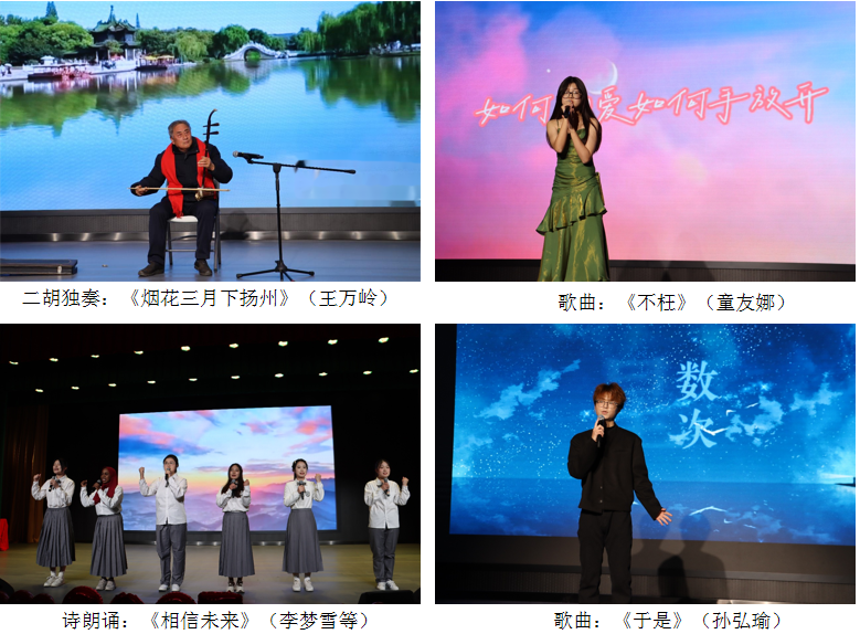 舞蹈《girls never die》青春绽放,活力四射;歌曲《于是》《不枉》既有现代气韵,又有古典美感;朗诵《相信未来》慷慨激昂,激人奋进;退休教师王万岭心潮澎湃,为在座的观众奉献了一曲二胡独奏《烟花三月下扬州》。