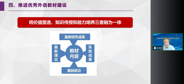 随后,华中科技大学徐锦芬教授作了题为“新时代高校外语教材建设路径”的主旨报告,阐述了新时代高校外语教材建设的内涵和建设路径,徐锦芬从教材建设的思政性、跨学科性和智能化三个方面探讨了如何在新时代背景下加强高校外语教材建设,提出以思政内容丰富的教材为载体,以“互联网+”为技术手段,培养“外语+”复合型人才的建设思路。