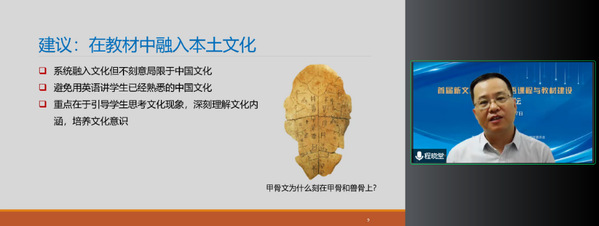 紧接着,北京师范大学外国语言文学学院程晓堂教授作了题为“英语教材种融入本土文化的策略”的主旨报告,生动地阐述了如何在英语教材中融入本土文化,帮助英语教学真正地实现“走出去”,指出教材内容要引导学生思考文化现象,深刻理解文化内涵,培养文化意识;教材既要包括传统文化,也要包括现代和当代文化;教材要注重联系学生自己的文化经验、认知、情感。