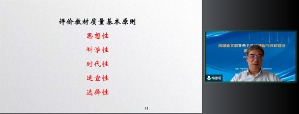 接着,上海外国语大学梅德明教授作了题为“外语课程教材建设的根本遵循和评价标准”的主旨报告,回答了身处“乌卡时代”的教育工作者究竟要为未来设计什么样的教育、为面向未来的课程编写什么样的教材这样的问题,教材建设要围绕“立德树人、培根铸魂、启智增慧”这十二个字展开。梅德明就教材质量的评价标准提出五个基本原则——思想性、科学性、时代性、适宜性、选择性。