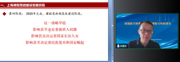 下午的论坛由主旨报告和圆桌论坛两个环节组成。首先进行的是主旨报告环节,第一位发言的是上海市教科院德育研究院党支部书记、副院长宗爱东博士,报告题为“新文科背景下的课程思政——一场深刻的变革”,探索了新文科课程思政的发展历史和脉络,以及课程思政与新文科教课程的关联,他强调课程思政建设在学校落地生根至少要经历政策、规范、文化三个层面,新文科背景下的课程思政是一种教育趋势的转变,一种教育立场的坚定,也是一种教育方法的回归。