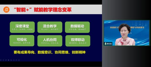 最后发言的是华南师范大学谢幼如教授,报告题为“人工智能赋能新文科课程变革”,她通过具体案例阐述了如何借助人工智能,实现新文科课程的系统化变革和结构化创新。