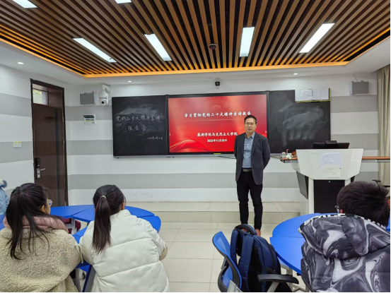为深入学习宣传贯彻党的二十大精神,用党的二十大精神统一思想和凝聚力量,帮助同学们深入领悟党的二十大精神,11月30日,校党委委员、组织部部长柯应根赴22级英语一班宣讲党的二十大精神。
