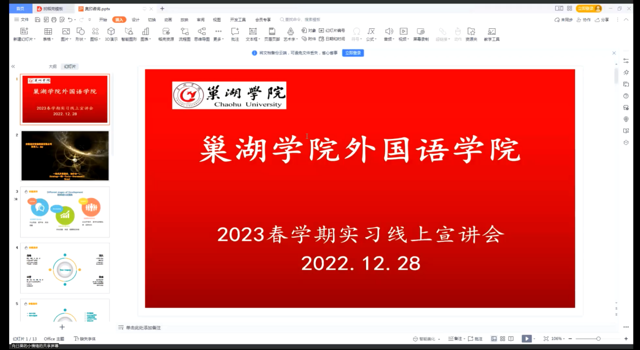2022年12月28日,外国语学院举行了春学期毕业实习线上宣讲会,2019级商务英语专业第二批实习学生参加了本次会议。会议开始,商务英语教研室主任奚伟就春学期实习的内容和意义做了讲解,并就同学们关心的问题做了解答。同时对参加实习宣讲的四家企业进行了简单介绍。