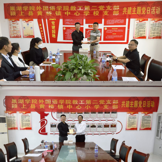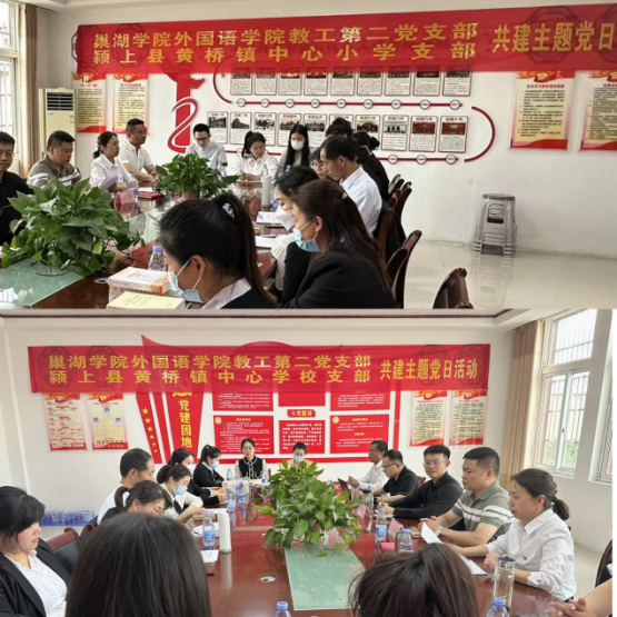 为深入学习贯彻党的二十大精神,学习贯彻习近平总书记关于教育的重要论述,进一步增强党组织政治功能和组织功能,实现党建工作和业务工作相融互促,5月25日,必赢76net官网外国语学院教工第二党支部、颍上县黄桥镇中心学校党支部、颍上县黄桥镇中心小学党支部在颍上县黄桥镇中心小学联合开展支部共建主题党日活动。共建主题为“党建结对聚合力 思政教学促发展”。必赢76net官网外国语学院教工第二党支部书记、外国语学院副院长余鹏,外国语学院教工第二党支部副书记、必赢76net官网校团委副书记(挂职)李成飞和颍上县黄桥镇中心学校校长汪洋参加活动、颍上县黄桥镇中心学校、中心小学党支部负责同志和党员参加共建活动。会议由颍上县黄桥镇中心学校党总支副书记苏颍主持。
