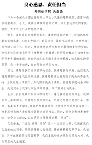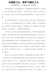 征集原创作品,常怀感恩之心。5月中下旬,外国语学院组织开展“诚信·感恩·担当”主题原创作品征集活动,学院各年级受资助学生积极参与本次活动,提交征文和书法作品热情高。作品主题鲜明,内容积极向上,展现了学院学子良好的精神状态。