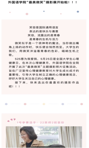 学院于5月22日至5月31日在易班平台开展“最美微笑”摄影展活动。本次活动吸引了同学们积极参与,大家踊跃晒出自己心中的最美微笑。有完成学习任务之后放松的微笑,也有经受磨练坚持挺过的笑容,还有用爱温暖人心充满正能量的微笑,这些都是日常生活中的点滴温暖。这些照片向大家展示了嘴角有笑、眼中有光、心中有爱的样子。同学们通过抓拍最美微笑,切身体会到了微笑的魅力。微笑着面对困难,困难就会变得弱小,挫折就会变成财富;微笑着看待事物,心胸就会变得宽广;微笑着承担重任,乐观就能减轻压力;微笑着面对生活,乐观将伴随我们一生。
