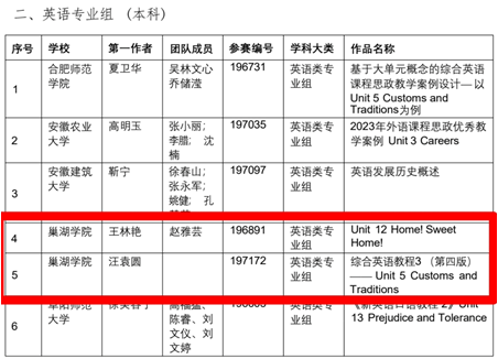 近日,安徽省外国语言文学学会公布了安徽省(本科)外语课程思政活动决赛环节的入围名单。经过第一轮线上筛选,全省本科高校共有16件作品入围安徽省(本科)外语课程思政案例评选活动的第二轮线下评比。学院共有4项课程思政教学案例进入安徽省决赛,入围数量位居第一。其中贺静团队和马曼华团队进入大学英语组决赛,王林艳团队和汪袁圆团队进入英语专业组决赛。