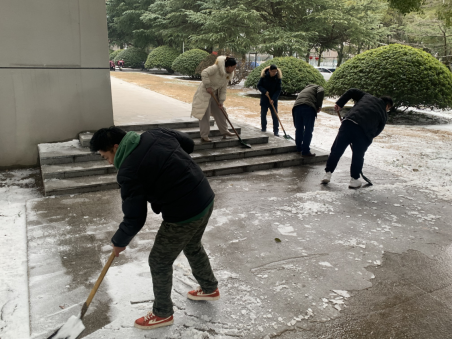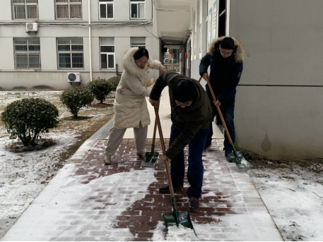 党员教师们对明德楼东西南北四个通道入口及周边进行扫雪除冰。大家不畏严寒,脚踏浮冰积雪,手拿铁锹、扫帚等工具,你铲我扫,将路面积雪浮冰向道路两旁空闲处集中堆放。经过大家一段时间不停歇的努力,很快将路面上的积雪浮冰清扫干净,消除了教学楼周边的安全隐患,确保了道路上的清洁和安全。