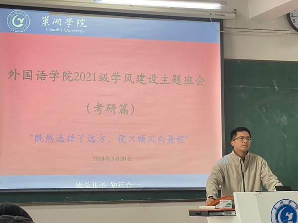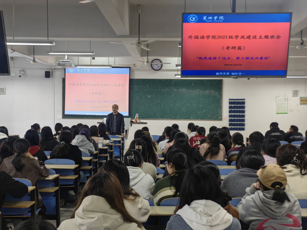 为提前营造外国语学院2025届同学们的考研氛围,明确考研目标,做好考研准备,3月20日下午,外国语学院组织开展2021级学风建设主题班会暨考研动员会。外国语学院党委副书记李磊出席并作了动员讲话,辅导员方磊主持,2021级全体同学参加。