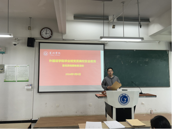 为营造安全、文明、健康、温情的校园毕业季氛围,引导毕业生坚守初心梦想、强化责任担当,进一步加强毕业生党员的先进性教育,发挥学生党员在毕业离校过程中的先锋模范作用。5月8日下午,外国语学院在慎思楼中102教室开展毕业生文明离校安全教育活动,学院各学生党支部书记及全体毕业班党员参加活动,学生第四党支部书记方磊主持。