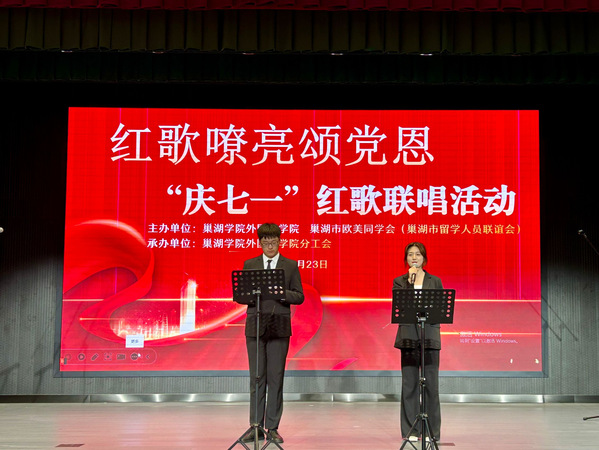 6月23日,外国语学院和巢湖市欧美同学会共同主办、外国语学院分工会承办的“庆七一”红歌联唱活动在大学生活动中心礼堂隆重举行。学院师生齐聚一堂,用嘹亮的歌声表达对党的深情祝福,展现新时代青年的精神风貌。
