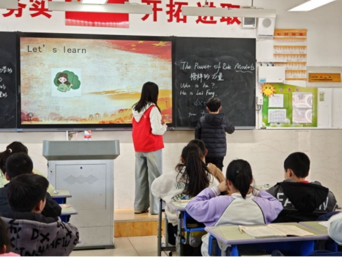 3月19日下午,实践团队成员赴盛桥镇中心小学开展“榜样力量”主题趣味英语公益课堂。课堂上,志愿者们用活泼有趣的方式,向同学们介绍雷锋的生平事迹,讲述雷锋做好事的小故事,让同学们深刻感受到雷锋精神的内涵。互动环节中,志愿者引导同学们分享身边的榜样故事,有的同学讲述了父母辛勤工作的点滴,有的分享了老师耐心教导的温暖瞬间,现场气氛十分活跃。
