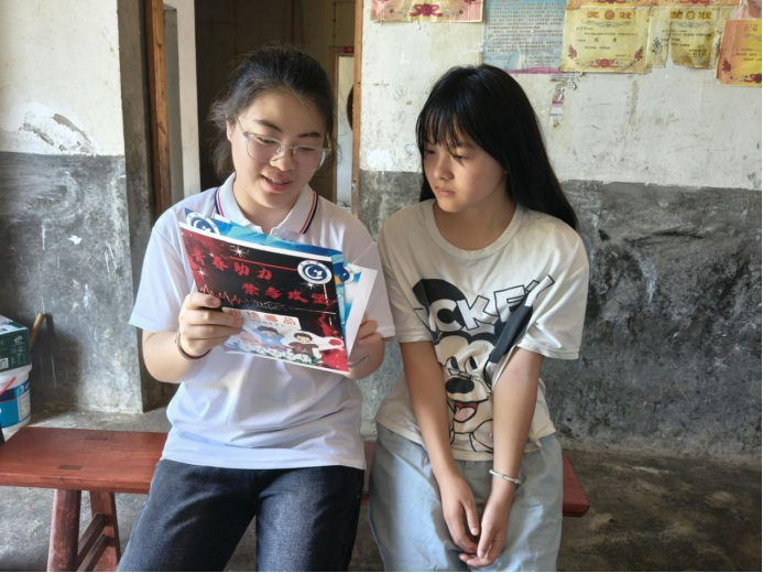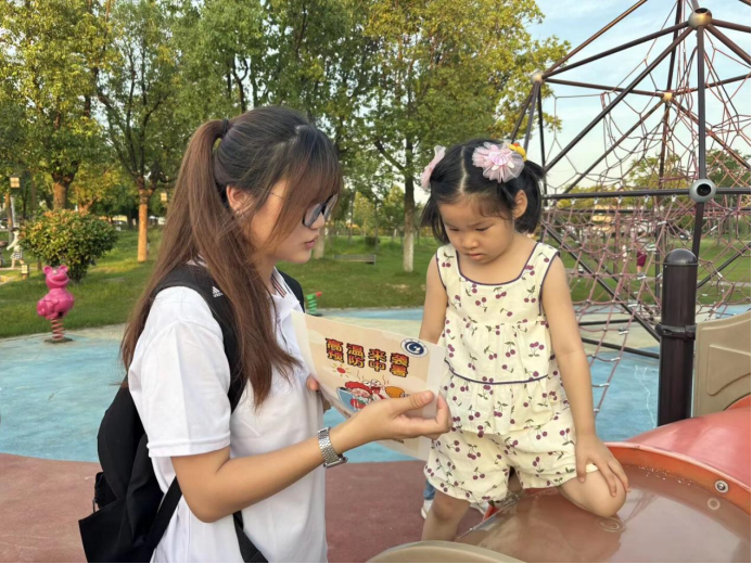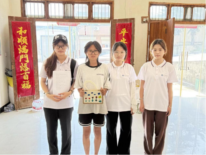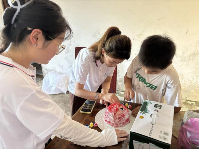 7月3日上午,实践团队前往盛桥镇陡岗村开展“送教下乡”泡泡趣味英语家庭公益课堂。活动中,团队成员拿出事先准备好的宣传海报,为小朋友普及电信诈骗、防溺水、防火灾等基本知识。随后,成员们拿出水彩颜料和图画纸与孩子一起绘画玩耍,在图画纸上绘上自己喜爱的图案。活动结束后,成员们将共同绘制的成果送给留守儿童留作纪念。此次活动让团队成员更加了解留守儿童的困难境况,成员们也尽自己的努力为孩子营造欢乐氛围,努力开拓其视野,学习更多知识。
