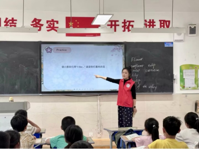 5月14日下午,实践团队成员赴盛桥镇中心小学开展“花卉学习”主题趣味英语公益课堂。课堂上,志愿者们通过精美的PPT展示,将世界各地绚丽多彩的花卉一一呈现。志愿者们用流利且生动的英语,详细介绍着这些花卉的名字、生长习性以及背后蕴含的文化寓意。志愿者温柔的讲解声中,孩子们认真聆听,努力跟着重复单词,明亮的眼睛里满是对新知识的渴望。
