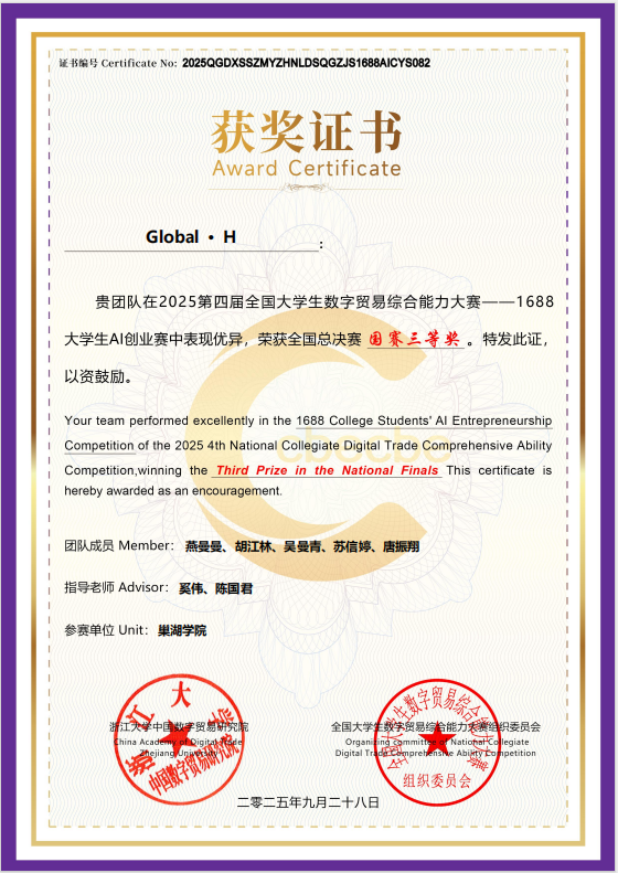 9月26日下午,参赛团队在指导教师的带领下,展开了紧张有序的全过程排练,从路演展示到临场答辩,不放过任何一个细节。27日上午,来自全国各地的100余支队伍陆续走进答辩现场,第四届全国大学生数字贸易综合能力大赛---1688大学生AI创业赛正式拉开帷幕。面对由5名评委组成的评审团,Global Horizon按照多日来的演练,有条不紊地完成了项目汇报。汇报结束后,评委们首先对团队成果给予肯定,随后围绕“货物投放平台、货物供应保障、客户问题及时响应”等关键环节进行提问,团队成员均给予准确且专业的答复。经过不懈努力,不畏强手,一路过关斩将,Global Horizon团队最终获得国赛三等奖的好成绩。