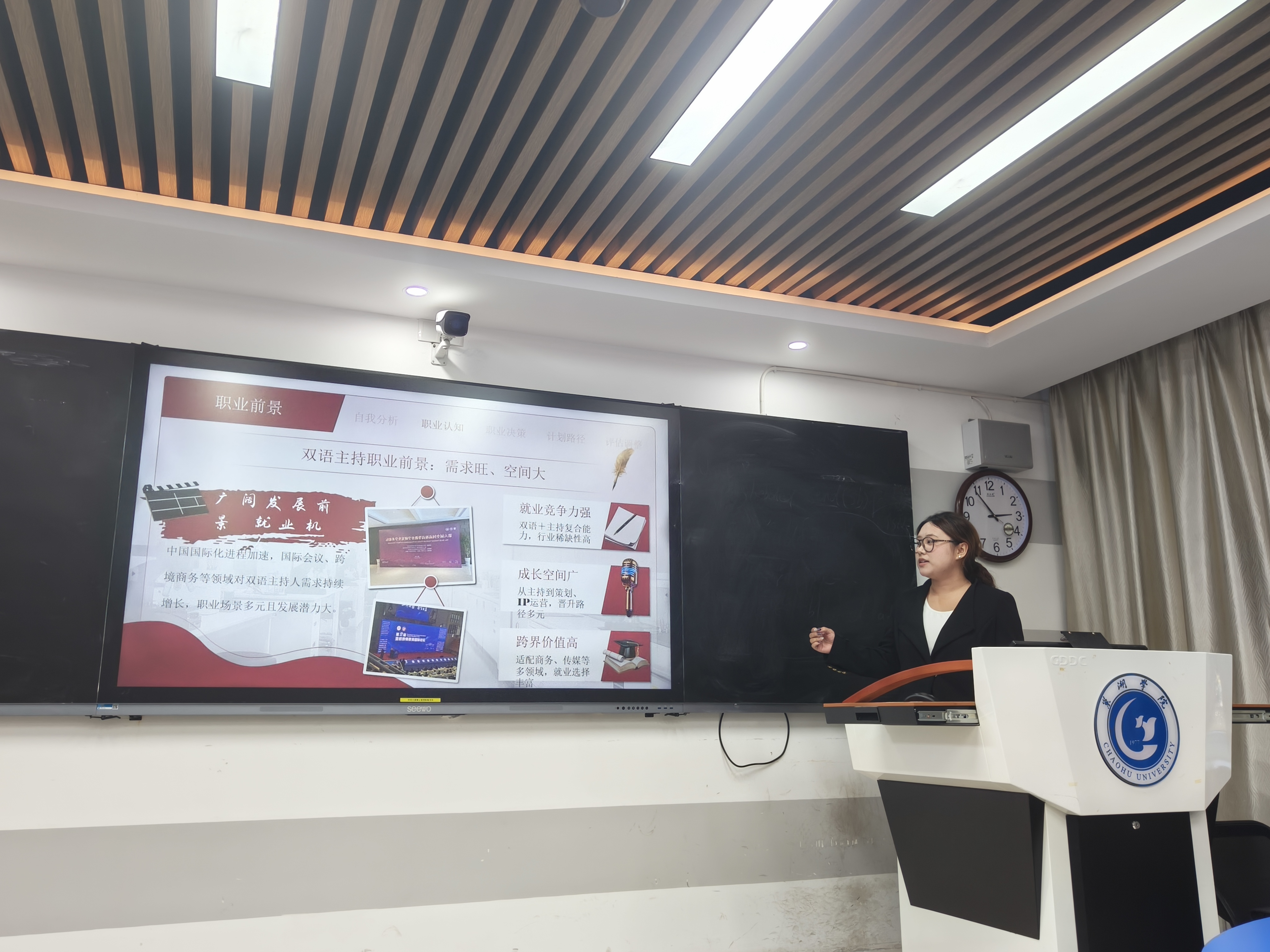 为增强大学生职业生涯规划意识,提高大学生职业规划能力和就业能力,10月22日下午,外国语学院在明德楼105智慧教室举办“筑梦青春志在四方 规划启航职引未来”第三届大学生职业规划大赛,外国语学院党委副书记李磊、全体辅导员担任比赛评委,本次比赛由学院就业联络员余仁能主持。
