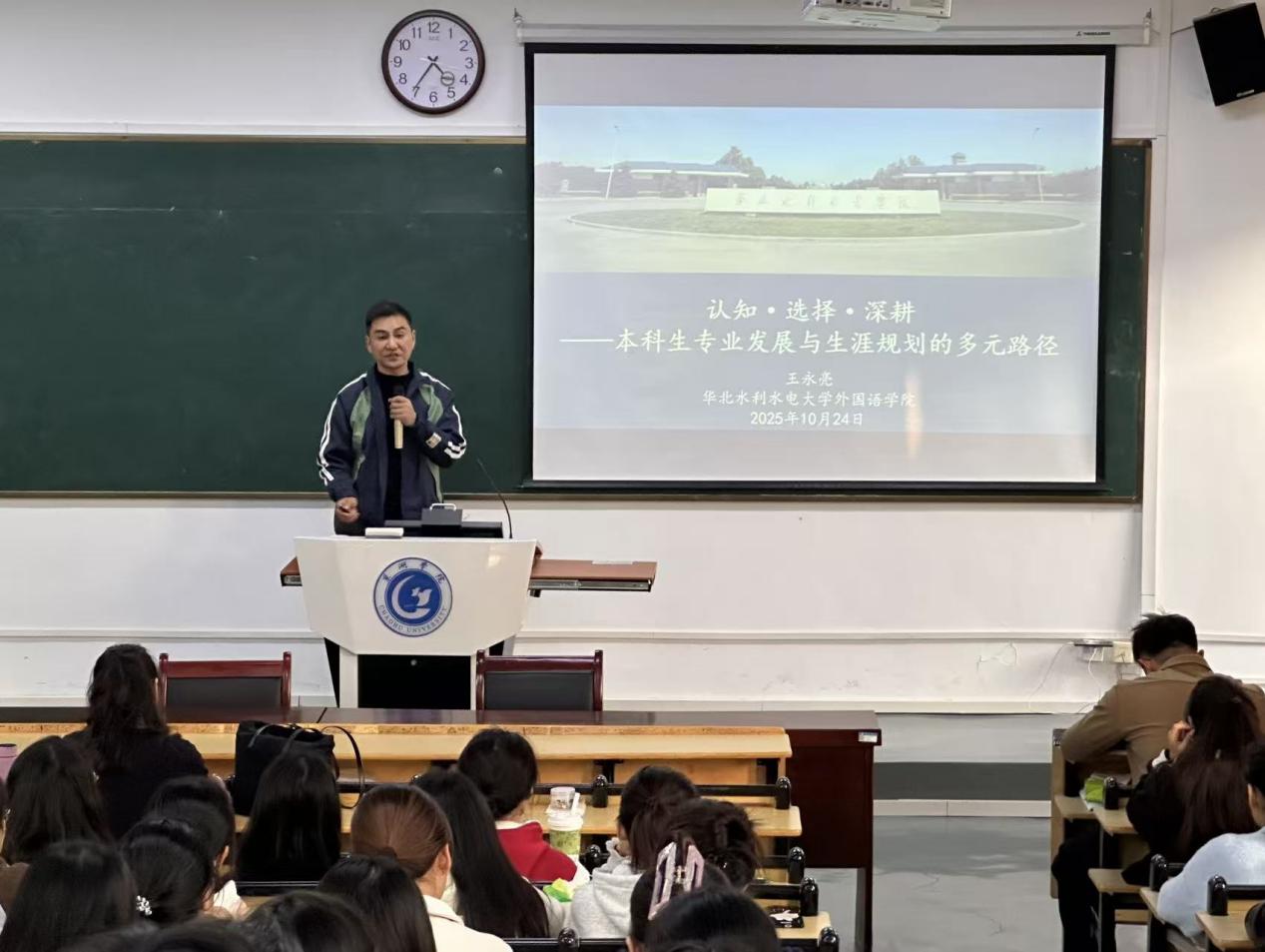 10月24日下午,华北水利水电大学外国语学院副教授、澳门理工大学博士生导师、南京师范大学硕士生导师王永亮为外国语学院学生开展了一场题为“认知·选择·深耕——本科生专业发展与生涯规划的多元路径”的主题讲座。