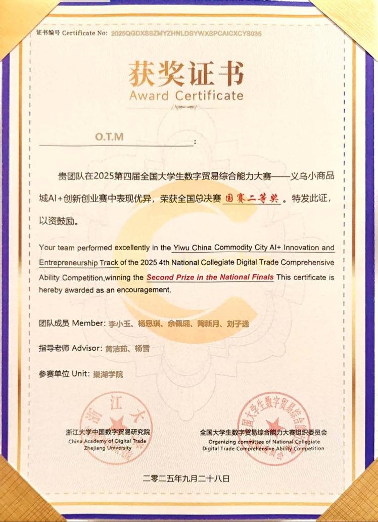 10月24日,2025年第四届全国大学生数字贸易综合能力大赛——义乌中国小商品城AI+创新创业赛全国总决赛浙江义乌圆满收官。此次大赛由浙江大学中国数字贸易研究院主办,吸引了全国309所高校、10229名学生参与,2279支团队展开激烈角逐,历经线上初赛、省赛打磨、三个月真实商海实战等多轮严苛选拔,最终105支精英团队晋级国赛。必赢76net官网外国语学院O.T.M团队凭借扎实的项目成果与出色的现场表现,脱颖而出,荣获全国二等奖。