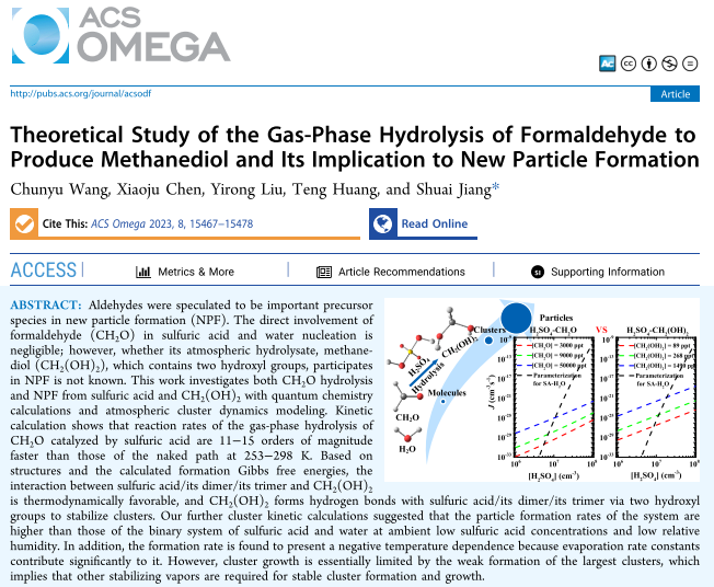 近日,中心研究人员王春雨博士在甲醛及其大气水解产物参与大气气溶胶成核研究中取得新进展,相关成果以“Theoretical study of the gas-phase hydrolysis of formaldehyde to produce methanediol and its implication to new particle formation”为题发表在国际权威期刊《ACS Omega》(中科院三区,IF:2.2)。