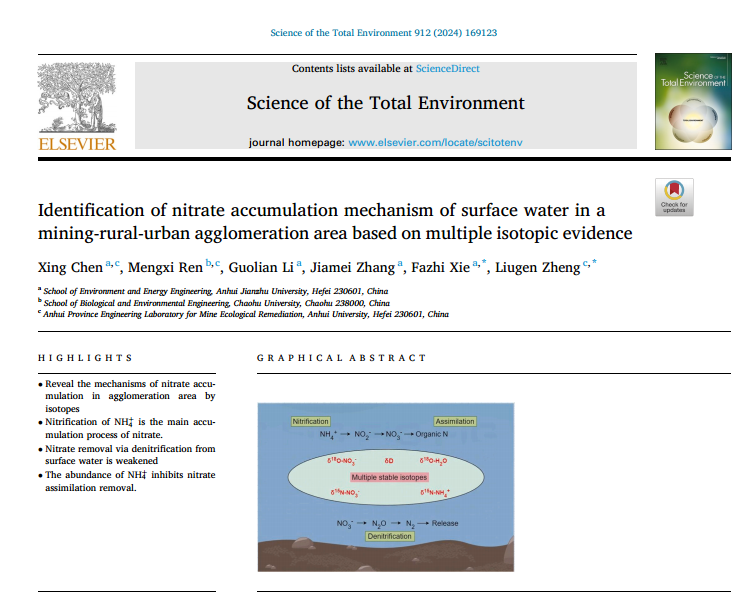 近日,中心研究人员任梦溪博士与安徽建筑大学陈星博士合作,在基于多重同位素证据的地表水硝酸盐积累机制研究中取得新进展,相关成果以“Identification of nitrate accumulation mechanism of surface water in a mining-rural-urban agglomeration area based on multiple isotopic evidence”为题发表在国际权威期刊《Science of the Total Environment》(中科院一区/Top期刊,IF:9.8)。