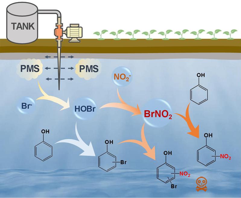 基于硫酸根自由基(SO4•-)的高级氧化工艺(SR-AOPs)在土壤及地下水污染的原位修复领域具有广阔应用前景。SO4•-可以由加热、紫外辐射、过渡金属离子或碱活化过一硫酸盐(PMS)或过二硫酸盐(PDS)产生,该自由基具有氧化电位高(2.5-3.1 V)、选择性好、寿命长和化学稳定性强等特点。以往的研究发现,环境中普遍存在的溴离子(Br-)和亚硝酸盐(NO2-)均能够被SO4•-氧化,生成一系列溴代副产物和硝基副产物。然而,目前对于未活化的PMS氧化过程中溴代和硝基副产物共生成情况鲜有研究。