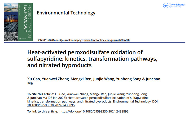近日,安徽省环巢湖乡村振兴协同技术服务中心(培育)研究人员高旭博士在水处理研究中取得新进展,相关成果以“Heat-activated peroxodisulfate oxidation ofsulfapyridine: kinetics, transformation pathways,and nitrated byproducts”为题发表在环境领域期刊《Environmental Technology》(JCRQ3,IF:2.2)。