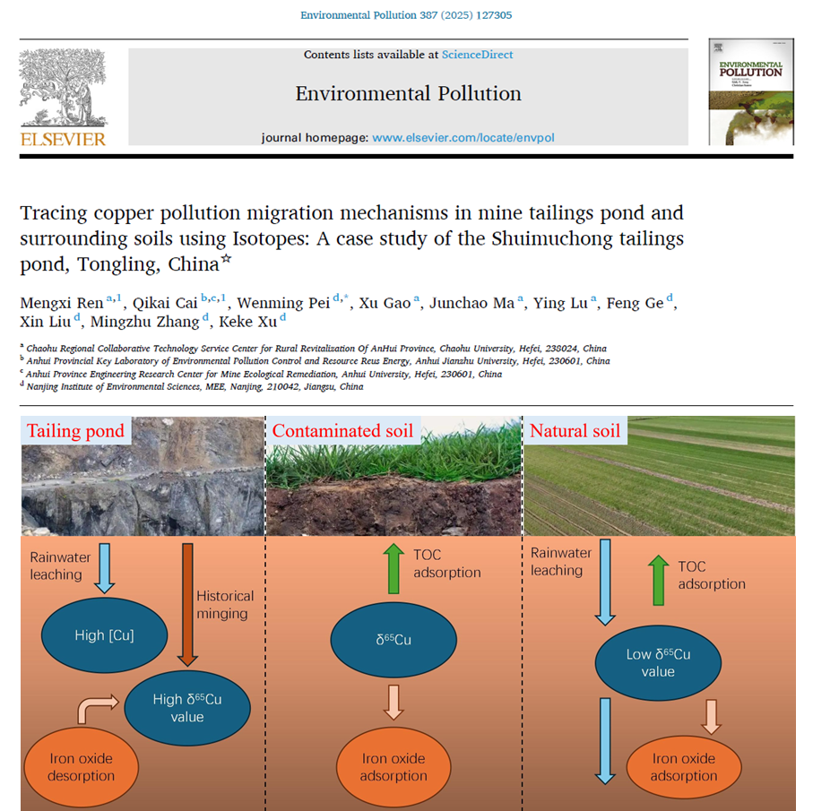 近日,安徽省环巢湖乡村振兴协同技术服务中心(培育)研究人员任梦溪在Cu同位素方法可有效示踪污染来源与迁移过程研究中取得新进展,相关成果以“Tracing Copper Pollution Migration Mechanisms in Mine Tailings Pond and Surrounding Soils Using Isotopes:A Case Study of the Shuimuchong Tailings Pond,Tongling,China”为题发表在国际权威期刊《Environmental Pollution》(中科院二区,IF:7.3)。