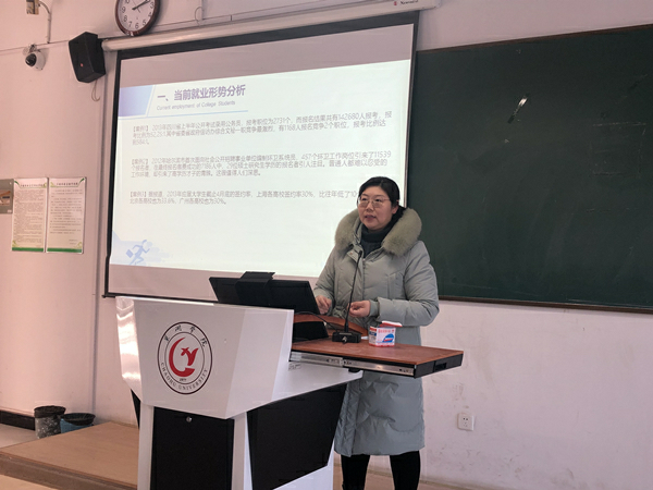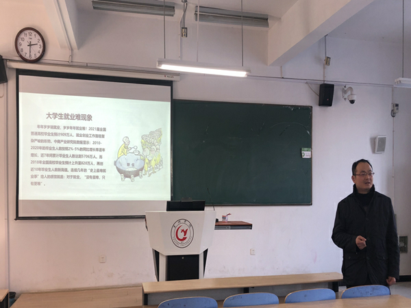 “就业难”是当今社会的一大现象,施玮以此为背景向同学们提出建议,指出同学们要合理定位、及时调整就业预期、积极主动就业。他强调在当下的社会背景下同学们应留意服务类、销售类岗位,重视职业市场的需求所在。