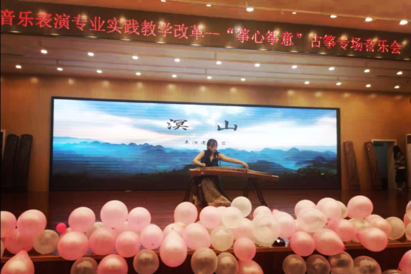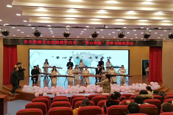 展演伊始,褚春元对艺术学院音乐表演专业实践课改革进行了介绍,指出今晚的古筝专场音乐会就是第二届音乐表演专业实践课改革成果汇报展演之一。音乐表演专业近年来狠抓实践教学,大力进行教学改革,申报研究课题,有力地促进学生的实践能力提升,取得良好的改革效果。主持人对由贡婷老师主讲的古筝课程进行了介绍:“筝”是中国最古老乐器之一,是“仁者之器”更是雅乐,常习者气质趋于古典、优雅。自古以来“筝”的演奏具有极强的感染力。而“古筝演奏”这门课程,作为一种技艺性特强的专业课程,在学习时必须经过长期的努力,并深刻地体会情感,掌握娴熟的技巧,才能完整地去表达一首乐曲。在学习的过程中,自然会得到一种古典音乐美的享受,古筝演奏时需要全身心投入,并且身体配合综合指法全身发力和运动,陶冶情操。在提高民族文化的时代环境中,推广“筝”文化,对民族音乐文化传播具有重大意义。随后,同学们以合奏、独奏、打击乐等形式组合表演了十首作品,依次为《战台风》《翠语》《枫桥夜泊》《香山射鼓》《溟山》《瑶族舞曲》《云裳诉》《临安遗恨》《林冲夜奔》以及古筝与长笛协奏曲《大鱼》,展演让同学们不仅在演奏能力上得到增益,也获取音乐文化知识,丰富积累,拓展视野,提高修养。
