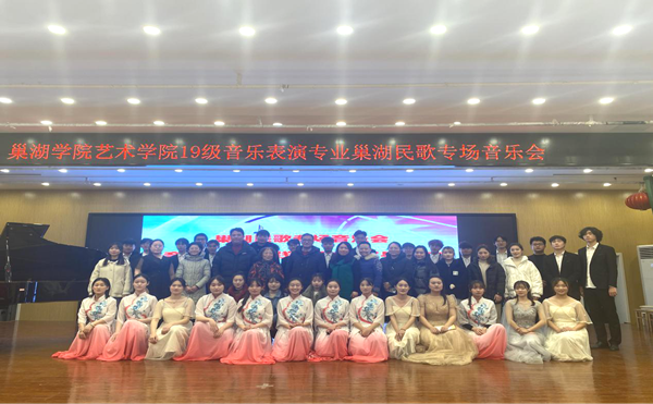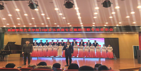 随后,由艺术教育中心巢湖民歌传承基地和音乐表演教研室徐频频、郭华、周泽汉老师精心策划,周泽汉老师导演的音表专业19级学生的“巢湖民歌专场音乐会音乐表演实践课改革成果汇报”以重唱、对唱、合唱等形式表演了十一首极具代表性的巢湖民歌,既有风靡一时的《巢湖好》、高昂激情的《绿浪滚滚迎面来》、悠扬清丽的《一支秧歌一趟秧》等大家耳熟能详的民歌,还有汉族民歌中唯一一首姑嫂对唱的《姑嫂对花》。最后一首清新秀丽的《十里长冲好风光》以器乐合奏的形式结束。