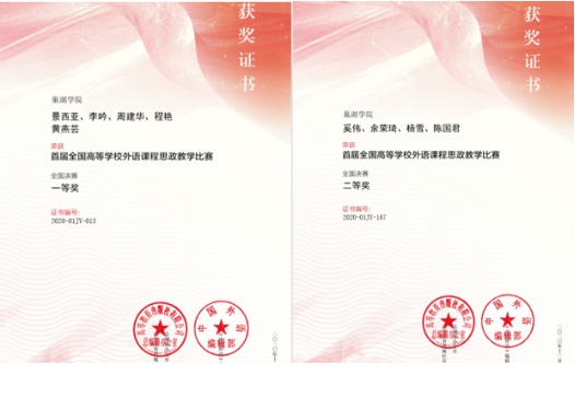 2020年12月18日至20日,在高等教育出版社主办的首届全国高等学校外语课程思政教学比赛中,外国语学院再接再厉,获得大赛一等奖、二等奖各一项。为深入贯彻落实习近平总书记关于教育的重要论述和全国教育大会精神,也为响应教育部《高等学校课程思政建设指导纲要》的精神,高等教育出版社和《中国外语》编辑部举办了本次比赛,旨在进一步挖掘外语课程中蕴含的思政元素,大力推动以“课程思政”为目标的课堂教学改革,使外语课程与思想政治理论课同向同行,全面提升全国高校外语教师课程思政教学能力。