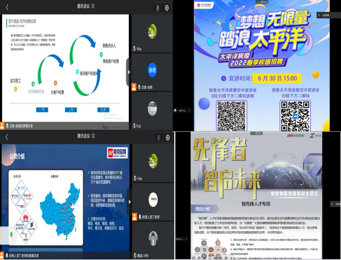 参加线上招聘会的企业有南京欣网通信科技股份有限公司、上海泛微网络科技股份有限公司、太平洋房屋、海康威视数字技术股份有限公司等四家单位。南京欣网企业由网络工程专业校友刘灿主讲,与其他各企业分别对公司概况、企业文化、岗位需求、薪资待遇以及职业前景等为同学们做了详细的宣讲,同学们对精彩宣讲产生浓厚的兴趣和高涨的热情。线上会议后,同学们积极投递简历,企业对学校学生积极的学习态度、求职热情、过硬的专业能力给予较高评价。