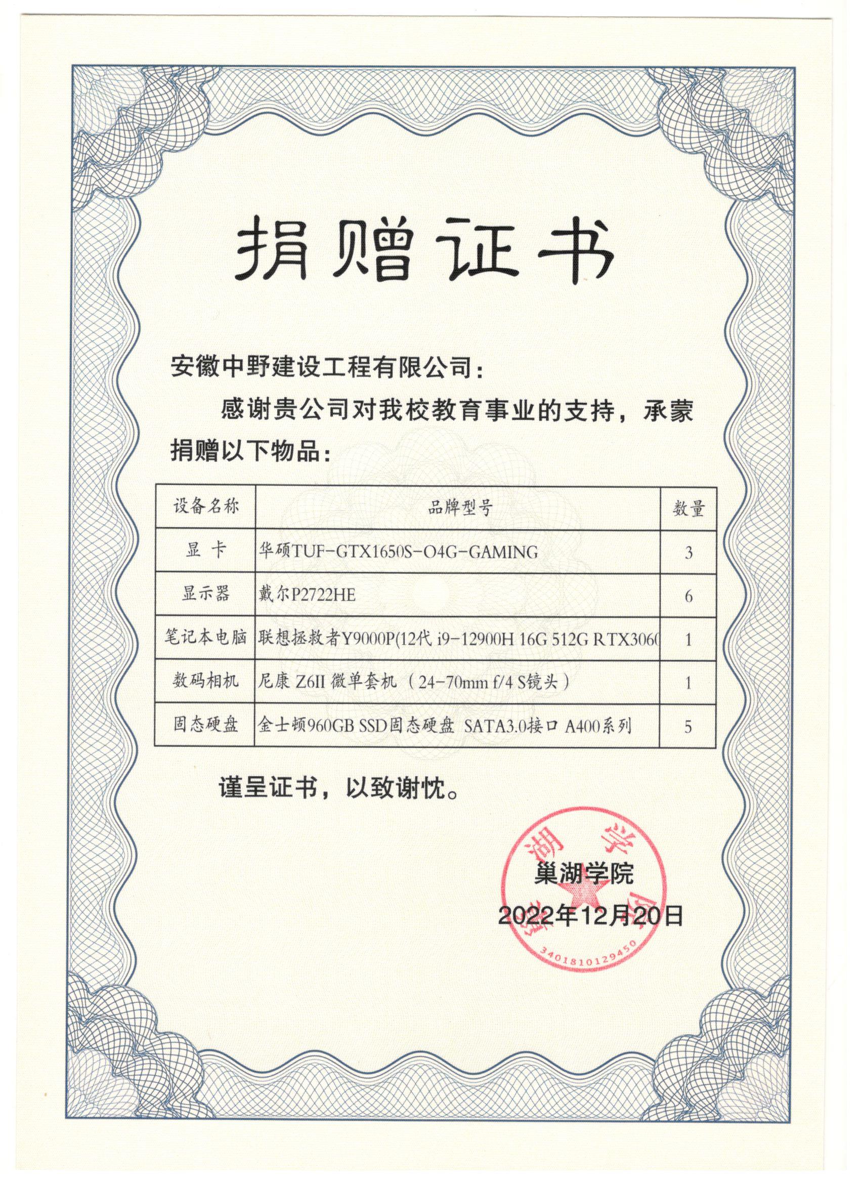 安徽中野建设工程有限公司捐赠电子数码产品十六件