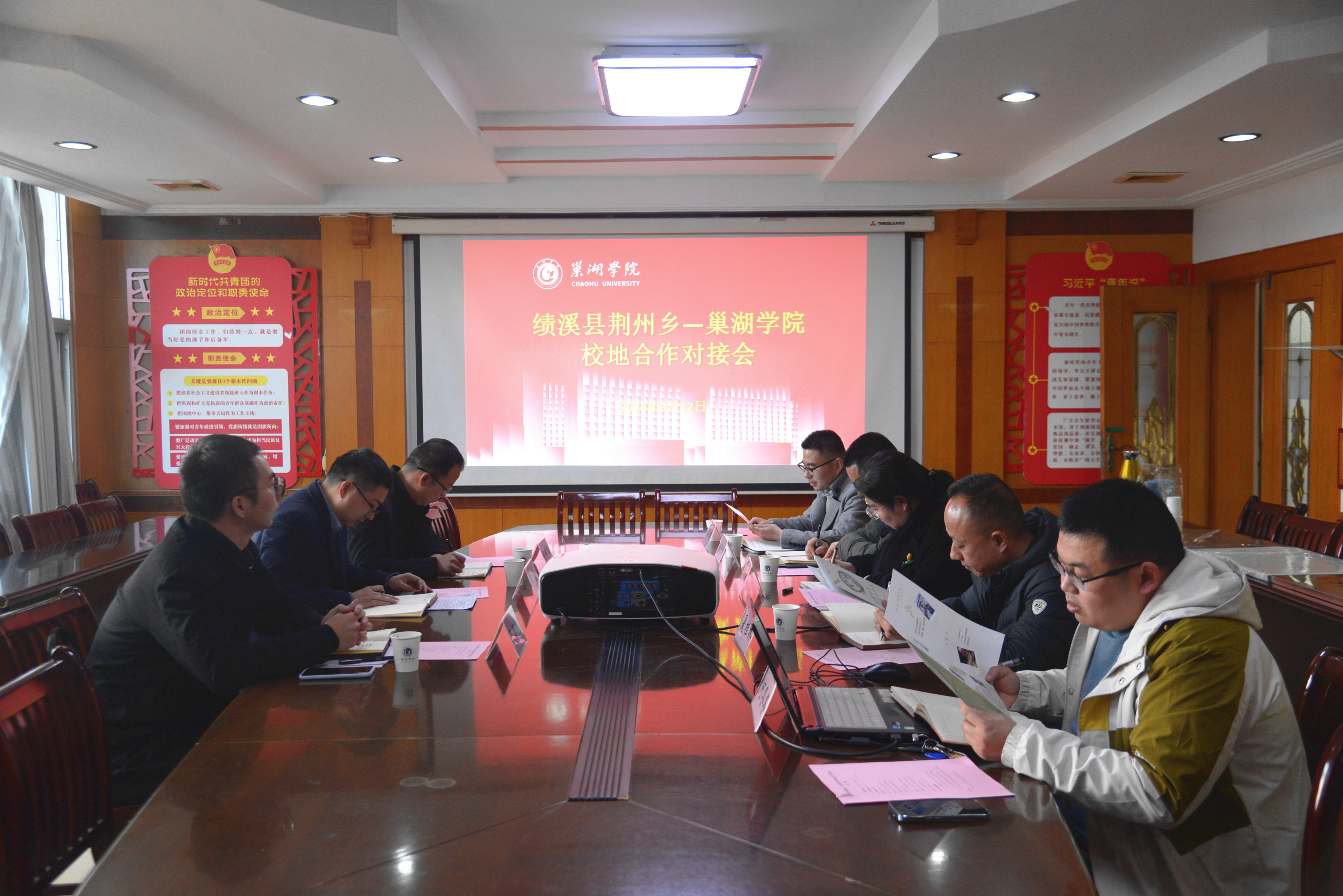 3月12日下午,绩溪县荆州乡党委副书记、乡长黄巍(电子工程学院2008届物理学专业毕业生)、团绩溪县委副书记王德辉、荆州乡党委副书记程利军一行来校对接交流校地合作工作。教工部、学工部、校团委、电子工程学院等单位负责同志参加座谈。对接会由校团委副书记王林主持。