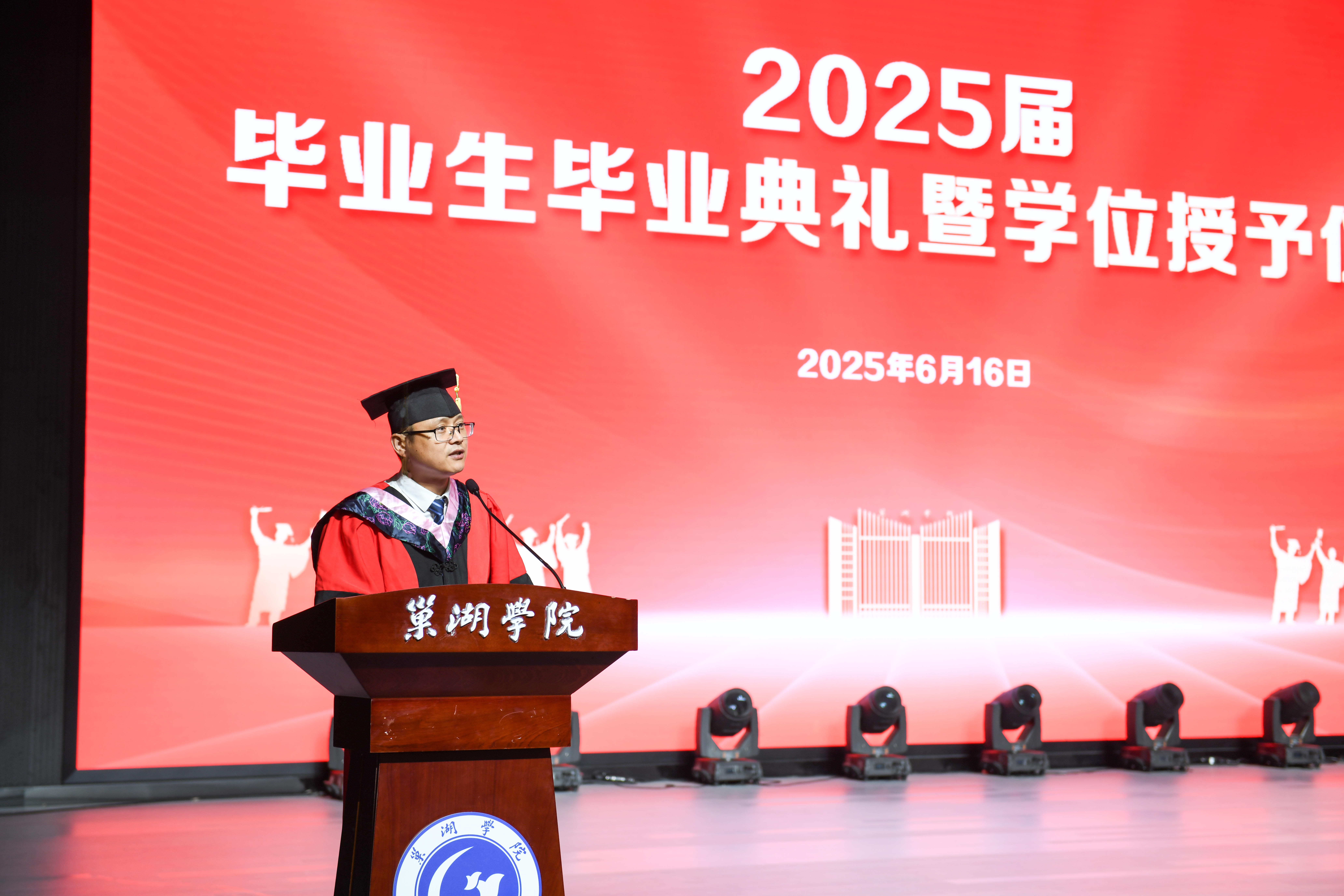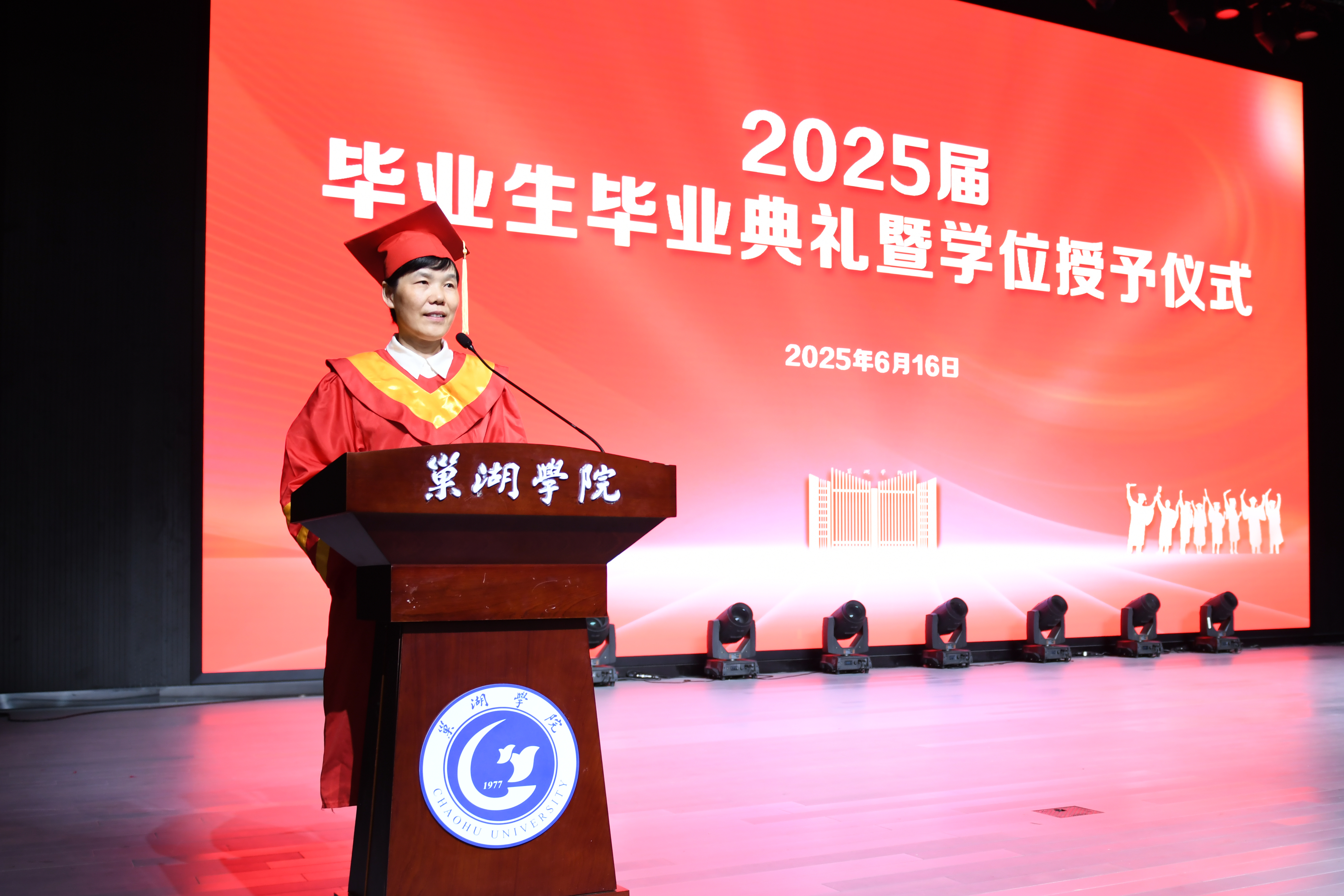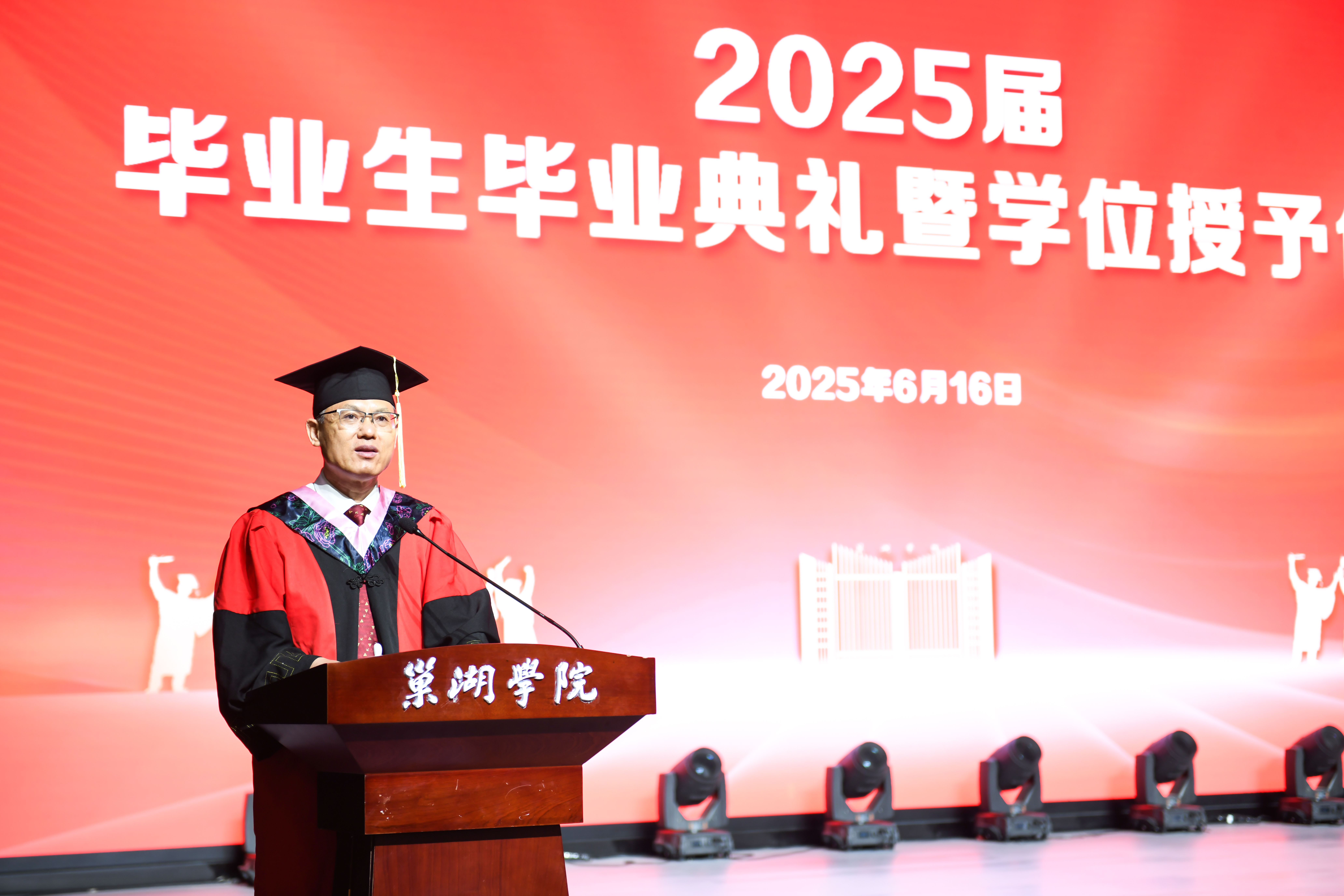 葱茏六月,巢湖之滨,骊歌声起,征途启航。在新的人生起点上,张莉深情寄语2025届毕业生,一要心系“国之大者”,在时代洪流中勇担使命。希望同学们无论身处何方、身居何职,都能胸怀“国之大者”,将个人奋斗的“小目标”融入强国建设、民族复兴的“大蓝图”,以高度的社会责任感和历史使命感,在平凡的岗位上创造不平凡的业绩,为国家富强、民族复兴、人民幸福贡献巢院人的智慧和力量。二要拥抱智能时代,在求知道路上步履不停。希望同学们永葆对知识的渴望与好奇,保持开放的学习心态,建立终身学习的习惯,善于学习运用AI技术,不断学习新知识、掌握新技能、拓展新视野,切实提升技术敏感度和学习迁移力,既要做新技术的拥抱者和使用者,更要努力成为未来创新的探索者和推动者。三要躬身实践创新,在社会熔炉中百炼成钢。希望同学们勇于走出舒适区,扎根祖国大地,深入基层一线,向实践学习,脚踏实地,不尚空谈,敢于到条件艰苦的地方去磨炼,锻造出担当重任的“宽肩膀”和“硬脊梁”,在解决实际问题的过程中增长才干,在火热的社会实践中绽放绚丽之花,书写无愧于时代、无愧于青春的华彩篇章!