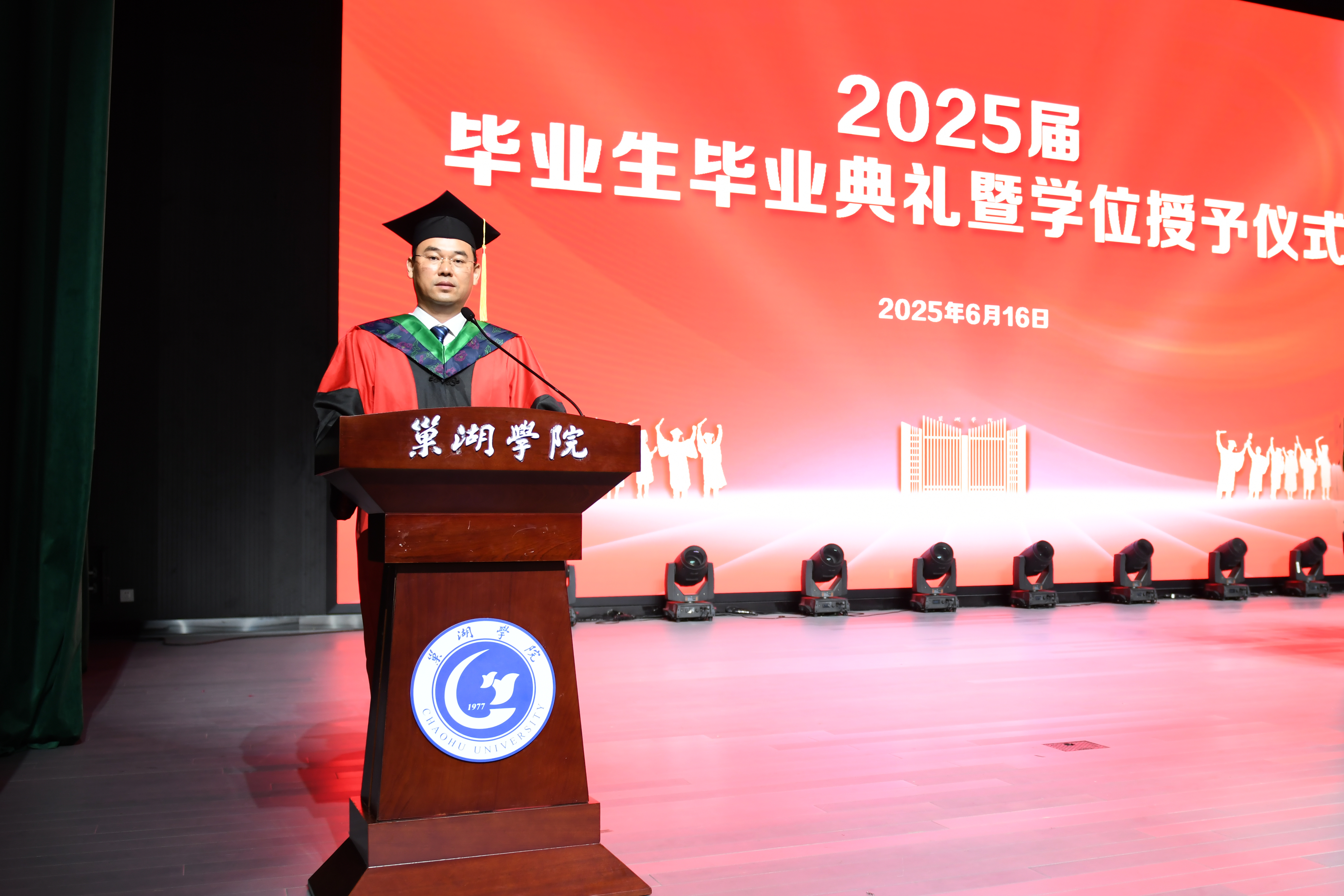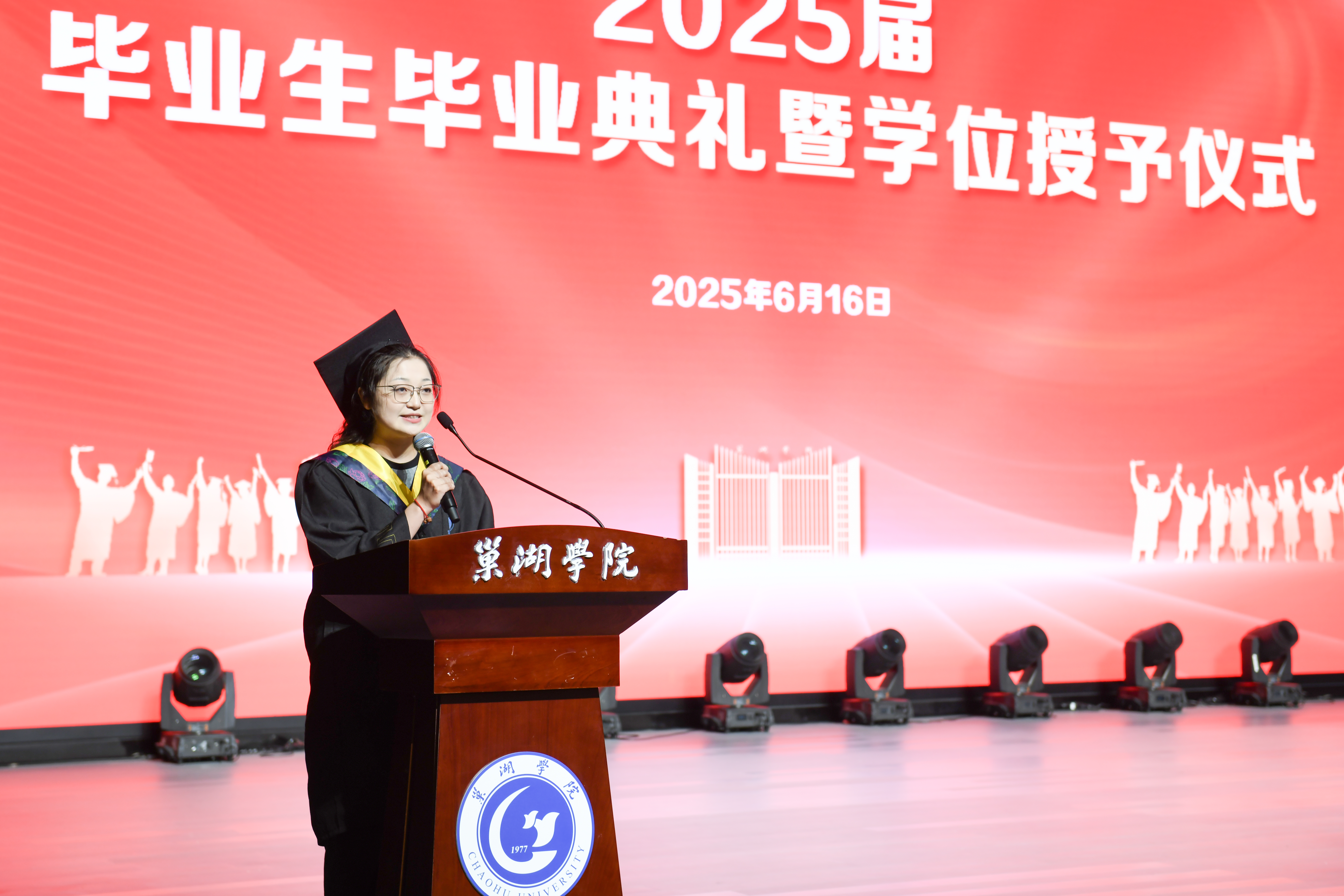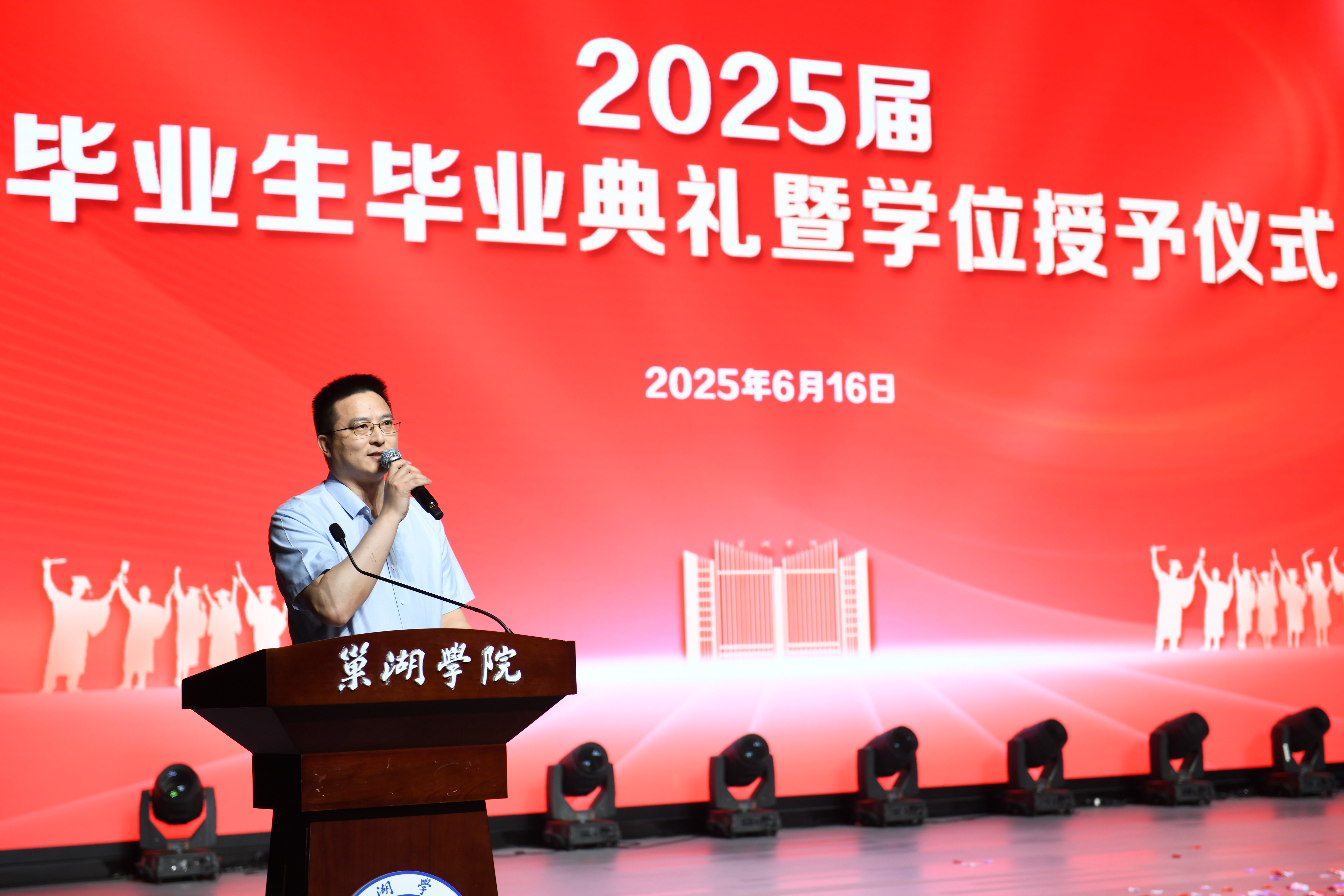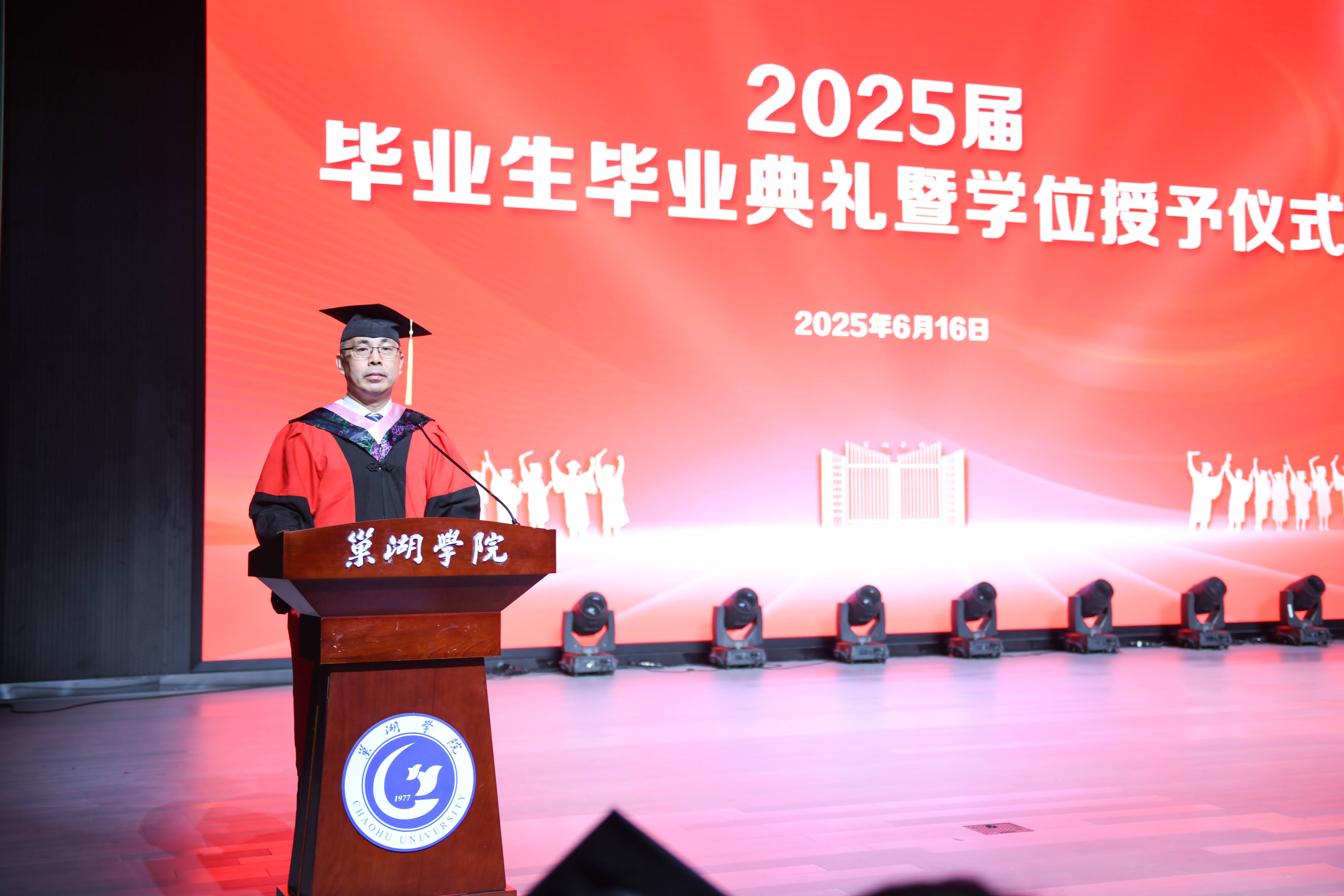葱茏六月,巢湖之滨,骊歌声起,征途启航。在新的人生起点上,张莉深情寄语2025届毕业生,一要心系“国之大者”,在时代洪流中勇担使命。希望同学们无论身处何方、身居何职,都能胸怀“国之大者”,将个人奋斗的“小目标”融入强国建设、民族复兴的“大蓝图”,以高度的社会责任感和历史使命感,在平凡的岗位上创造不平凡的业绩,为国家富强、民族复兴、人民幸福贡献巢院人的智慧和力量。二要拥抱智能时代,在求知道路上步履不停。希望同学们永葆对知识的渴望与好奇,保持开放的学习心态,建立终身学习的习惯,善于学习运用AI技术,不断学习新知识、掌握新技能、拓展新视野,切实提升技术敏感度和学习迁移力,既要做新技术的拥抱者和使用者,更要努力成为未来创新的探索者和推动者。三要躬身实践创新,在社会熔炉中百炼成钢。希望同学们勇于走出舒适区,扎根祖国大地,深入基层一线,向实践学习,脚踏实地,不尚空谈,敢于到条件艰苦的地方去磨炼,锻造出担当重任的“宽肩膀”和“硬脊梁”,在解决实际问题的过程中增长才干,在火热的社会实践中绽放绚丽之花,书写无愧于时代、无愧于青春的华彩篇章!