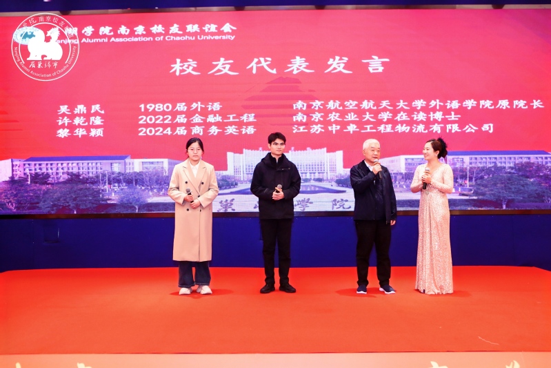 在随后的校友代表分享环节,南京航空航天大学外语学院原院长、1979届外语专业校友吴鼎民,南京农业大学在读博士、2022届金融工程专业校友许乾隆,江苏中卓国际物流有限公司职员、2024届商务英语专业校友黎华颖三位校友结合自身经历,深情回忆母校岁月,尽管年级不同、行业各异,但“巢院人”的共同身份让大家瞬间拉近了距离。会场内始终洋溢着温馨、热烈、感人的气氛。