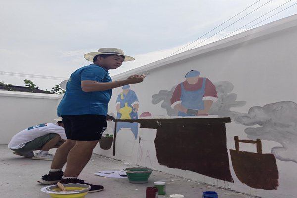 团队积极和当地村委会对接,根据地方需求,确定了“党建引领新农村”,“珍惜粮食”,“团结和睦一家人”等墙绘主题。队员们围绕着主题积极发挥专业所长,在一遍遍涂改中领悟摸索,在一日日磨练中精进技艺,在一幅幅墙绘中成长蜕变…… 队员们怀着一腔热爱融入乡村,用画笔装点起砖壁石墙。当一幅幅精美画作呈现时,引来了村里很多老人孩子前来观光打卡!