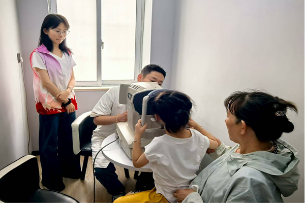检查正式开始后,眼科医生严格按照专业流程,为每一位孩子开展视力检测、电脑验光、色盲色弱检测等基础检查。医生耐心引导着略显紧张的孩子,手中的验光仪器精准捕捉着每一项数据。此时,“瞳心暖巢” 的队员们化身 “护眼小助手”,全程在旁协助:他们站在队伍旁维持秩序,轻声提醒 “下一位小朋友准备好啦”。