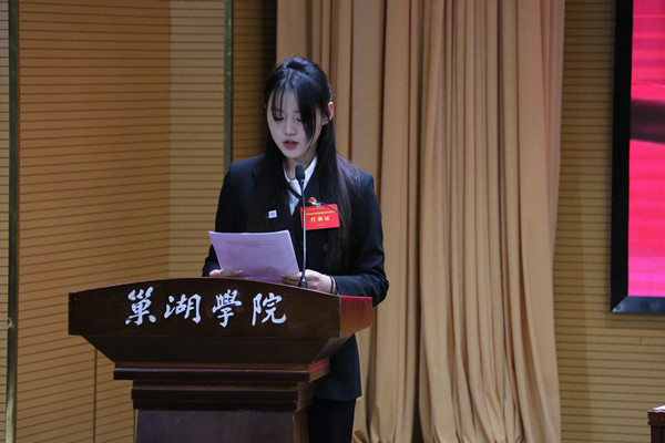 新当选的学生会委员赵佳代表发言,她表示,将不负学院领导、老师的信任和全体同学的期望,牢记服务宗旨,以身作则、务实创新,带领新一届学生会班子凝心聚力、真抓实干,不断提升工作质量和水平,努力开创学院学生工作新局面。