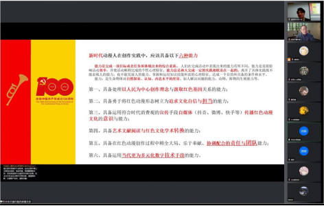 讲座开始,孙亮书记对叶佑天教授和讲座主题进行介绍。随后叶佑天教授以红色文化视域下的动漫创作实践为背景,深度解读新时代动漫人应具备的六种能力:第一、具备处理以人民为中心创作理念与汲取红色基因关系的能力;第二、具备勇于将红色动漫形态树立为追求文化自信与担当的能力;第三、具备运用自媒体(抖音、微博、快手等)传播与宣传红色动漫文化的意识与能力;第四、具备艺术文献阅读与红色文化学术转换的能力;第五、具备在红色动漫创作过程中顾全大局、乐于奉献、协调配合的团队能力;第六、具备运用当代更为多元化数字技术手段的能力。